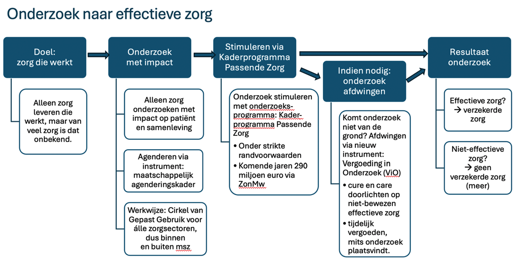 4. Onderzoek stimuleren via het Kaderprogramma Passende Zorg. Dit programma helpt zorgpartijen om te onderzoeken welke zorg effectief is en welke niet – en dus uit het basispakket kan (zie H3 Kennis en inzicht).