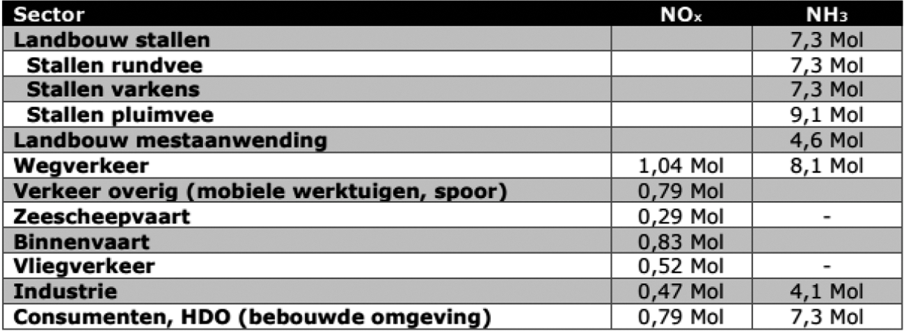 – De effectiviteit van extra emissiereductie in de sectoren: Als gevolg van het verschil in eigenschappen en verspreidingskarakter tussen NOX en NH3 heeft de reductie van ammoniak een fors groter effect op de depositiedaling op Natura 2000-gebieden dan stikstofoxiden. Het effect is ook afhankelijk van de bronkenmerken, zoals de uitstoothoogte en de afstand tot Natura 2000-gebieden. De reductie van een kiloton NOX vanuit de industrie is gemiddeld genomen een factor 10 tot 20 minder effectief voor het reduceren van depositie op Natura 2000-gebieden dan reductie van een kiloton NH3 in de landbouw. De reductie van een kton NOX vanuit wegverkeer of binnenvaart is gemiddeld een factor 7–8 minder effectief voor het reduceren van depositie op Natura 2000-gebieden dan reductie van een kiloton NH3 in de landbouw, zoals onderstaande tabel 2 van RIVM laat zien.13
