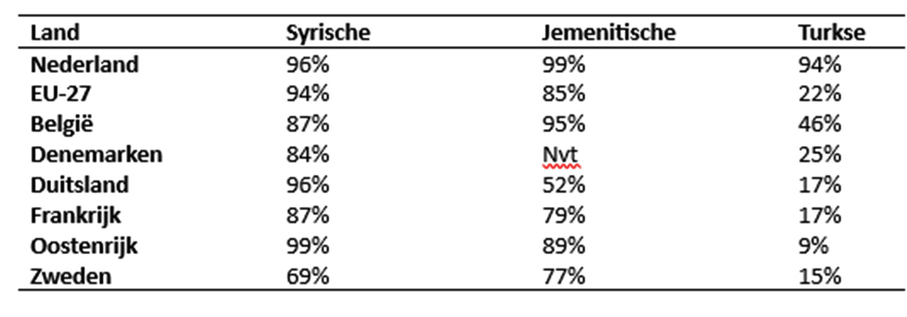 Antwoord: In de Staat van Migratie wordt data van de IND gebruikt om de nationale inwilligingspercentages te berekenen. Voor een vergelijking van het inwilligingspercentage in de EU-lidstaten wordt gebruik gemaakt van de gegevens in Eurostat, ook voor Nederland.38 De definitie van het inwilligingspercentage verschilt op Europees en nationaal niveau. Op Europees niveau, binnen Eurostat, worden aanvragen die niet in behandeling worden genomen op grond van de Dublinverordening, niet meegeteld als afwijzing. Ook wordt het percentage berekend over de afwijzingen en de inwilligingen. Bij de nationale cijfers wordt het inwilligingspercentage berekend over alle beslissingen, inclusief de niet-inhoudelijke beslissingen zoals buiten behandeling stelling, inclusief aanvragen die niet in behandeling worden genomen op grond van de Dublinverordening. Op basis van Eurostat zijn de inwilligingspercentages voor Nederland voor asielzoekers met de Syrische, Jemenitische en Turkse nationaliteit respectievelijk 96%, 99% en 94%. Onderstaande tabel geeft de inwilligingspercentages voor deze nationaliteiten weer voor de EU-27 alsmede voor België, Denemarken, Duitsland, Frankrijk, Oostenrijk en Zweden.