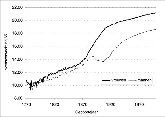 Figuur 2: Levensverwachting voor 65-jarigen naar geboortejaar 1770–2000