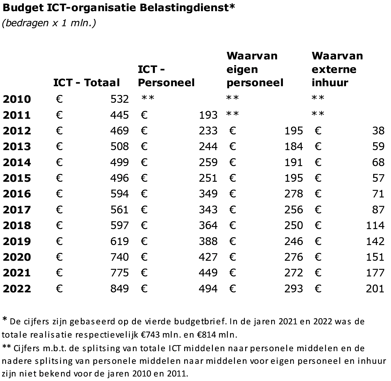 In het overzicht hieronder ziet u de jaarlijkse budgetten van de ICT-organisatie van de Belastingdienst in de periode 2010–2022. De middelen voor de ICT-organisatie zijn bestemd voor zowel personele als materiële uitgaven. De personele uitgaven zijn als onderdeel van de totale ICT-uitgaven (kolom 1) apart inzichtelijk gemaakt, met daarbij ook een nadere splitsing naar eigen personeel en externe inhuur.
