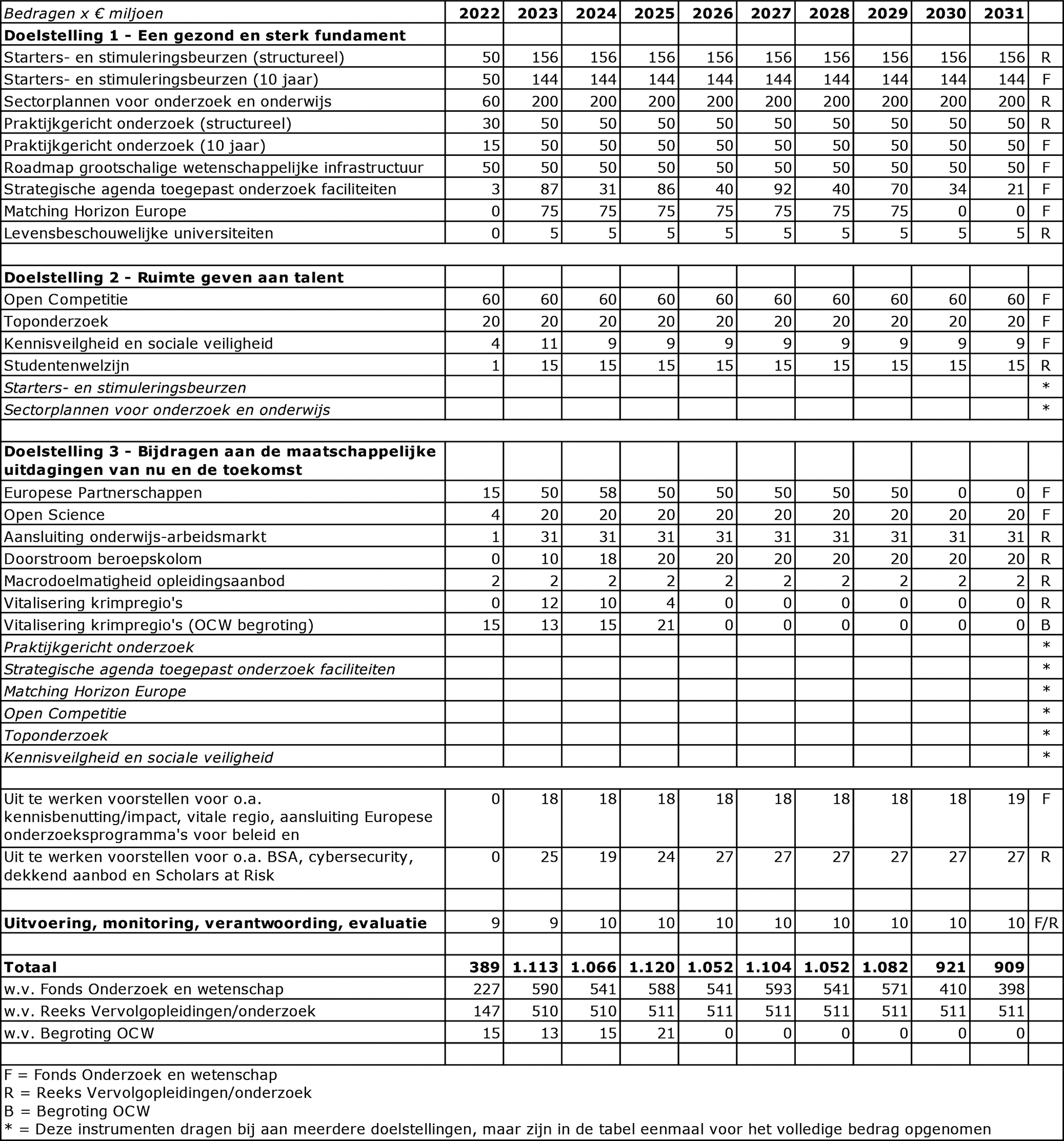 Voor het fonds voor Onderzoek en Wetenschap betreffen dit per hoofddoel de volgende beleidsinstrumenten: • Hoofddoel 1: starters- en stimuleringsbeurzen (paragraaf 1.1.1), praktijkgericht onderzoek (1.1.3), grootschalige wetenschappelijke infrastructuur en faciliteiten voor toegepast onderzoek (1.1.4) en Matching Horizon Europe (1.1.5). • Hoofddoel 2: Kennisveiligheid en sociale veiligheid (paragraaf 2.1.1 en 3.2.3) en open competitie en toponderzoek (2.2.1). • Hoofddoel 3: Europese Partnerschappen (paragraaf 3.2.2) en open science (3.3.1). De instrumenten voor de middelen uit het Coalitieakkoord voor de Vervolgopleidingen/onderzoek zijn vooral de sectorplannen voor onderwijs en wetenschap (paragraaf 1.1.2) en een structurele bijdrage voor praktijkgericht onderzoek (1.1.3). Verder betreft het instrumenten voor studentenwelzijn (2.1.3), de aansluiting onderwijs-arbeidsmarkt en doorstroom beroepskolom (3.1). |