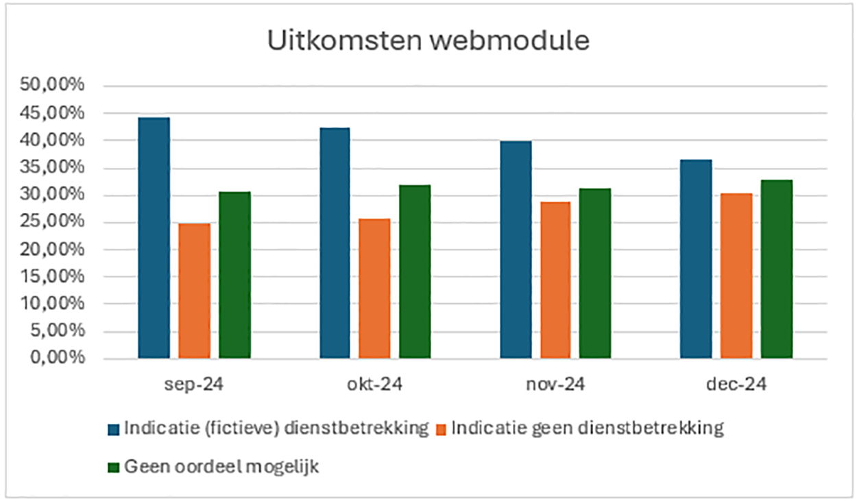 Uit deze cijfers blijkt dat het aandeel «indicaties dat er mogelijk sprake is van een (fictieve) dienstbetrekking» maandelijks afneemt (van 44,3% in september 2024 tot 36,7% in december 2024). Tegelijkertijd is het aandeel «indicatie geen dienstbetrekking» toegenomen (van 24,9% in september 2024 tot 30,5% in december 2024). Ook is het aandeel «geen oordeel mogelijk» lichtelijk gestegen (van 30,8% in september 2024 tot 32,8% in december 2024).
