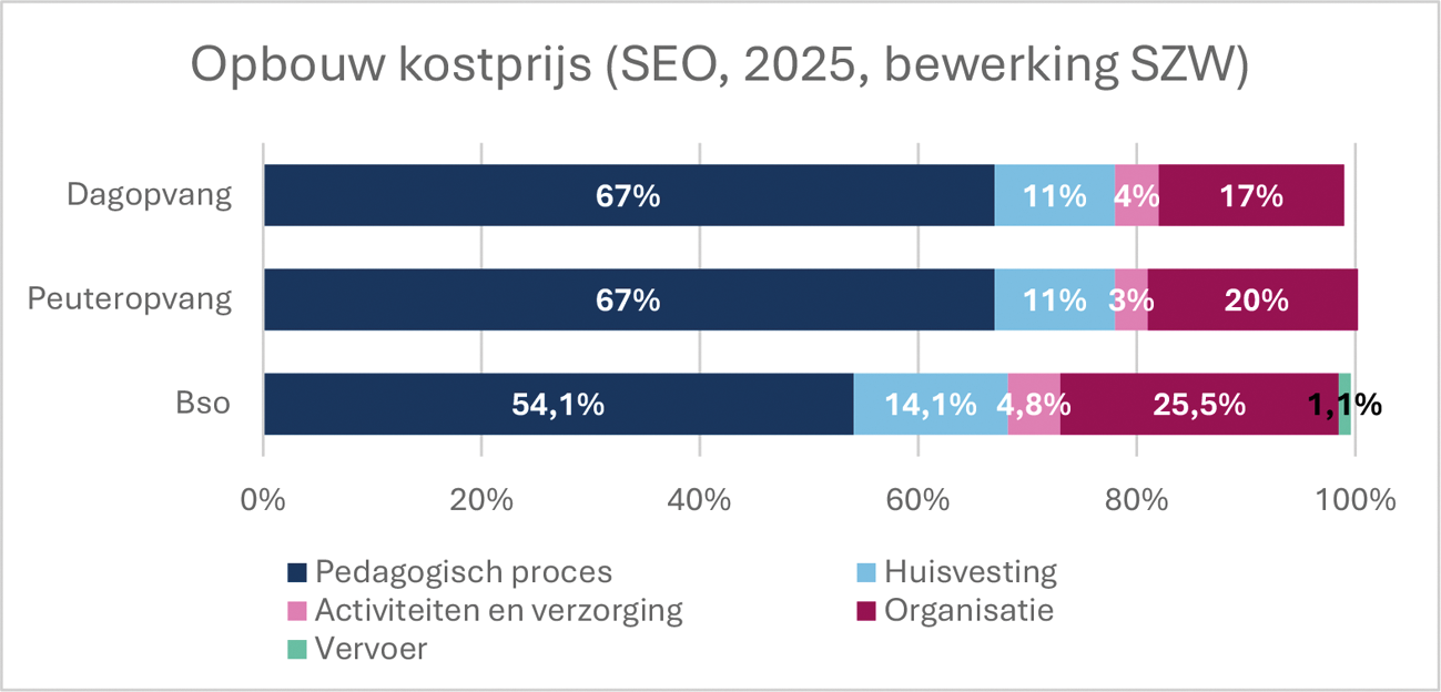 Uit het onderzoek blijkt dat het grootste deel van de kosten bestaat uit kosten voor pedagogisch personeel. Hieronder vallen alle salaris- en overige personeelskosten van pedagogisch professionals die op de groep staan. Na kosten voor pedagogisch personeel volgen de organisatiekosten10 en huisvestingskosten11. Kosten voor activiteiten en verzorging bedragen bij dagopvang, peuteropvang en buitenschoolse opvang slechts 3 tot 5% van de totale kostprijs.