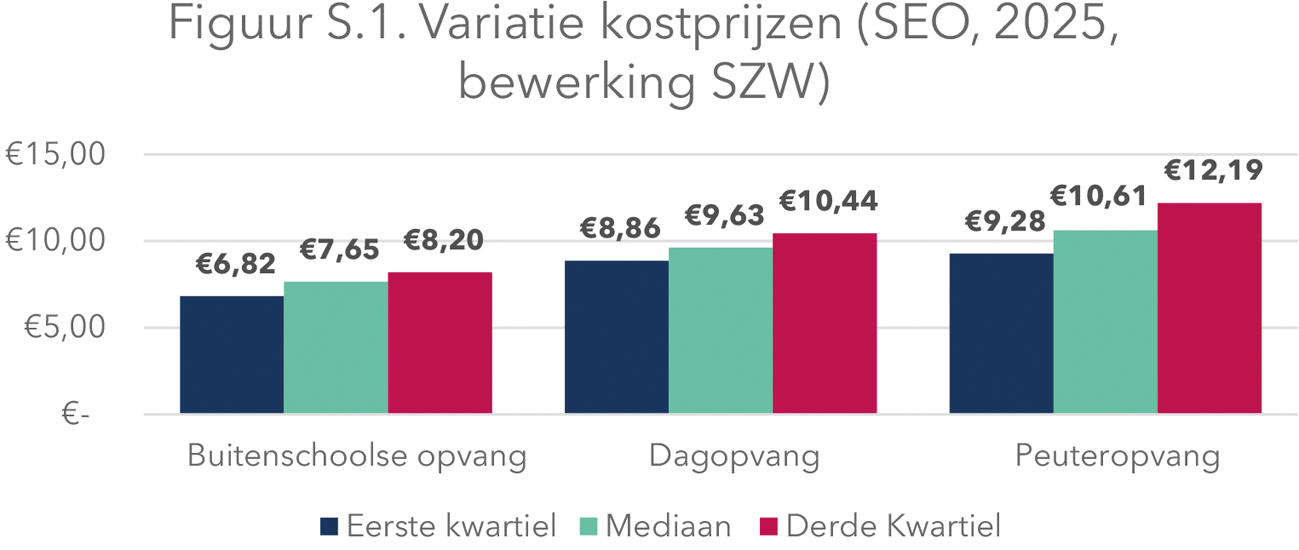 De maximum uurprijzen voor dagopvang en bso bedragen in 2025 € 10,71 en € 9,52. De mediane kostprijs voor dagopvang lijkt dus in lijn met de maximum uurprijs. In de bso ligt de mediane kostprijs onder de maximum uurprijs, terwijl de mediane kostprijs in de peuteropvang juist hoger ligt dan de maximum uurprijs. Volgens SEO wordt de relatief hoge kostprijs van peuteropvang met name gedreven door voorschoolse educatie, waarvoor aanvullende kwaliteitseisen gelden. Hier ontvangen gemeentenmiddelen voor van het Rijk via het Ministerie van Onderwijs, Cultuur en Wetenschap.