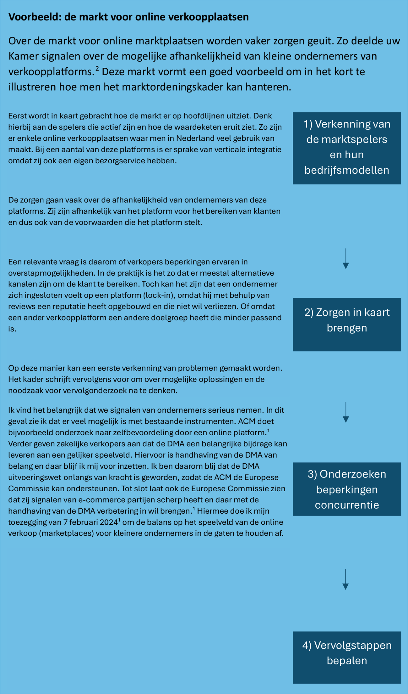 De komende jaren ben ik voornemens het marktordeningskader als uitgangspunt te gebruiken bij discussies over beleid voor de werking van digitale markten. Als er bijvoorbeeld zorgen zijn over (deel)markten of opkomende digitale markten, kan ik met behulp van het kader verkennen of er risico’s op problemen zijn, nu en in de toekomst. Ook andere beleidsdepartementen kunnen het kader gebruiken als zij te maken hebben met concurrentieproblemen in digitale markten. Verder dient het als basis voor gesprekken met stakeholders en de Tweede Kamer over het verbeteren van digitale markten. Bovendien kan een analyse aan de hand van het kader voor de Autoriteit Consument en Markt (ACM) aanleiding zijn om nader onderzoek in te stellen. Ten slotte kan het kader ook helpen om de inzet te bepalen voor evaluaties van bestaande regelgeving.