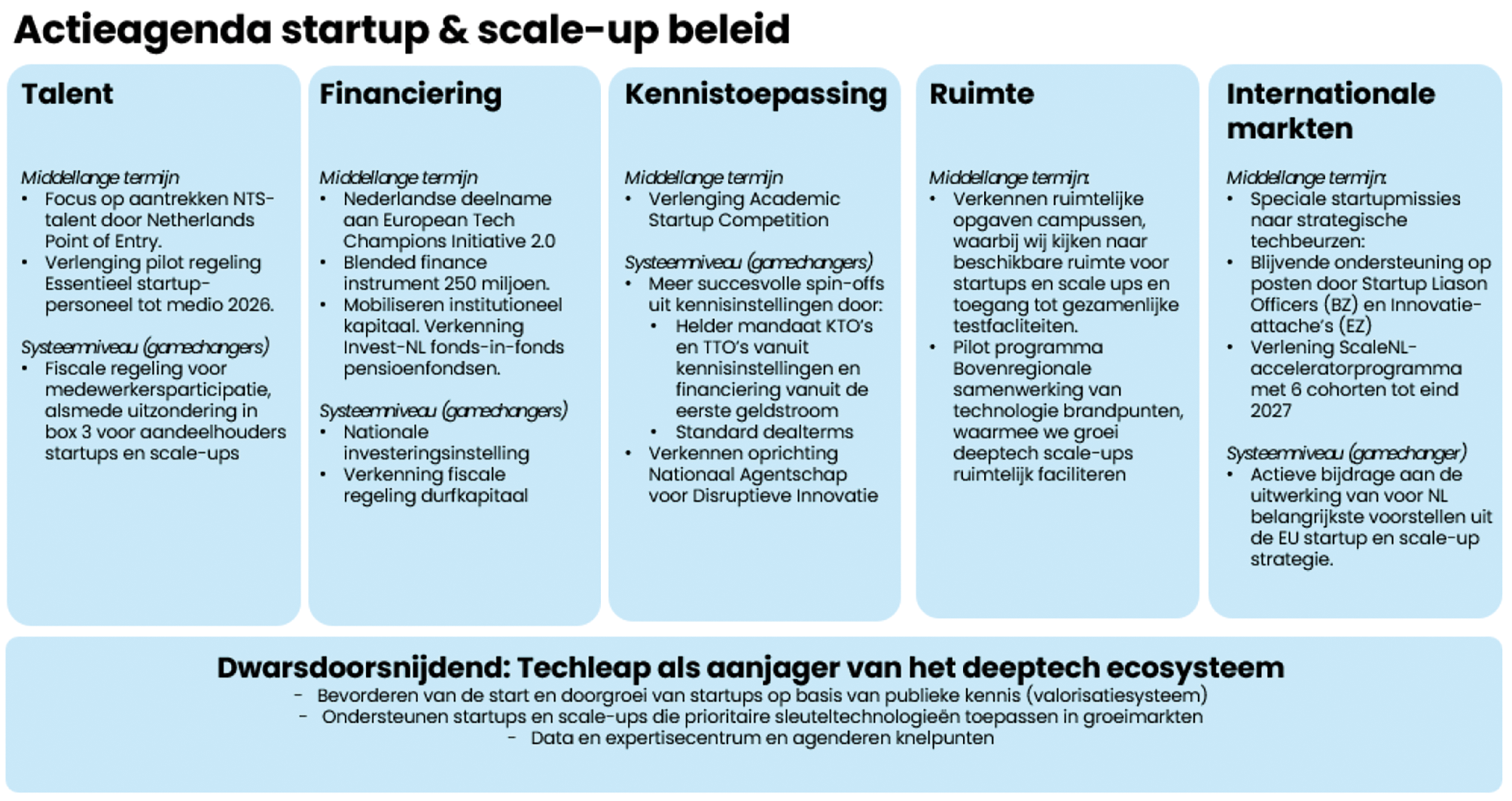 Het kabinet komt in deze brief – zoals mede door Uw Kamer verzocht – met een actieagenda om het ecosysteem voor startups en scale-ups te versterken. Het kabinet bouwt hiermee voort op de strategie «Startups en scale-ups als motor voor transities en groei», die in 2023 met Uw Kamer is gedeeld.13 De agenda bestaat uit een aantal acties voor de middellange termijn en een aantal systeemmaatregelen («gamechangers») en heeft als doel dat we meer succesvolle tech bedrijven in Nederland krijgen. Dit is een begin, maar er zal meer nodig zijn om structureel de doorgroei te verbeteren en meer succesvolle startups en scale-ups in Nederland te hebben en te houden.