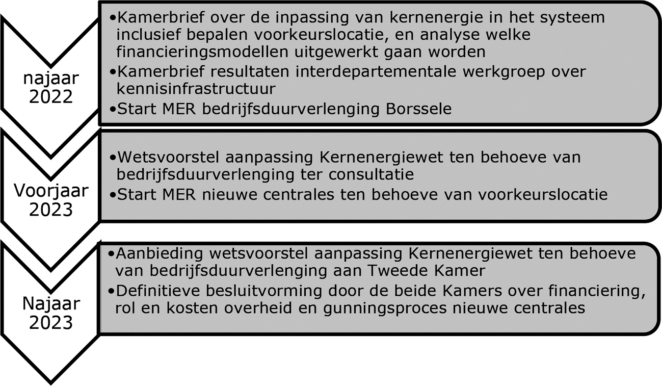 De Staatssecretaris van Infrastructuur en Waterstaat bereidt in samenwerking met mij het wetsvoorstel tot wijziging van de Kernenergiewet voor. Streven is dat het wetsvoorstel eind 2023 aan uw Kamer kan worden aangeboden. De MER-procedure, de internetconsultatie van het wetsvoorstel, besluitvorming door de ministerraad, advies van de Raad van State op het wetsvoorstel, het opstellen van het nader rapport en het aanbieden van de stukken aan het parlement, kosten de nodige voorbereidingstijd. De wetswijziging moet in werking zijn uiterlijk op het moment dat de aanvraag voor wijziging van de Kernenergiewetvergunning door de vergunninghouder van de Kerncentrale Borssele (EPZ) wordt ingediend bij de ANVS. We stemmen deze timing goed af met EPZ.