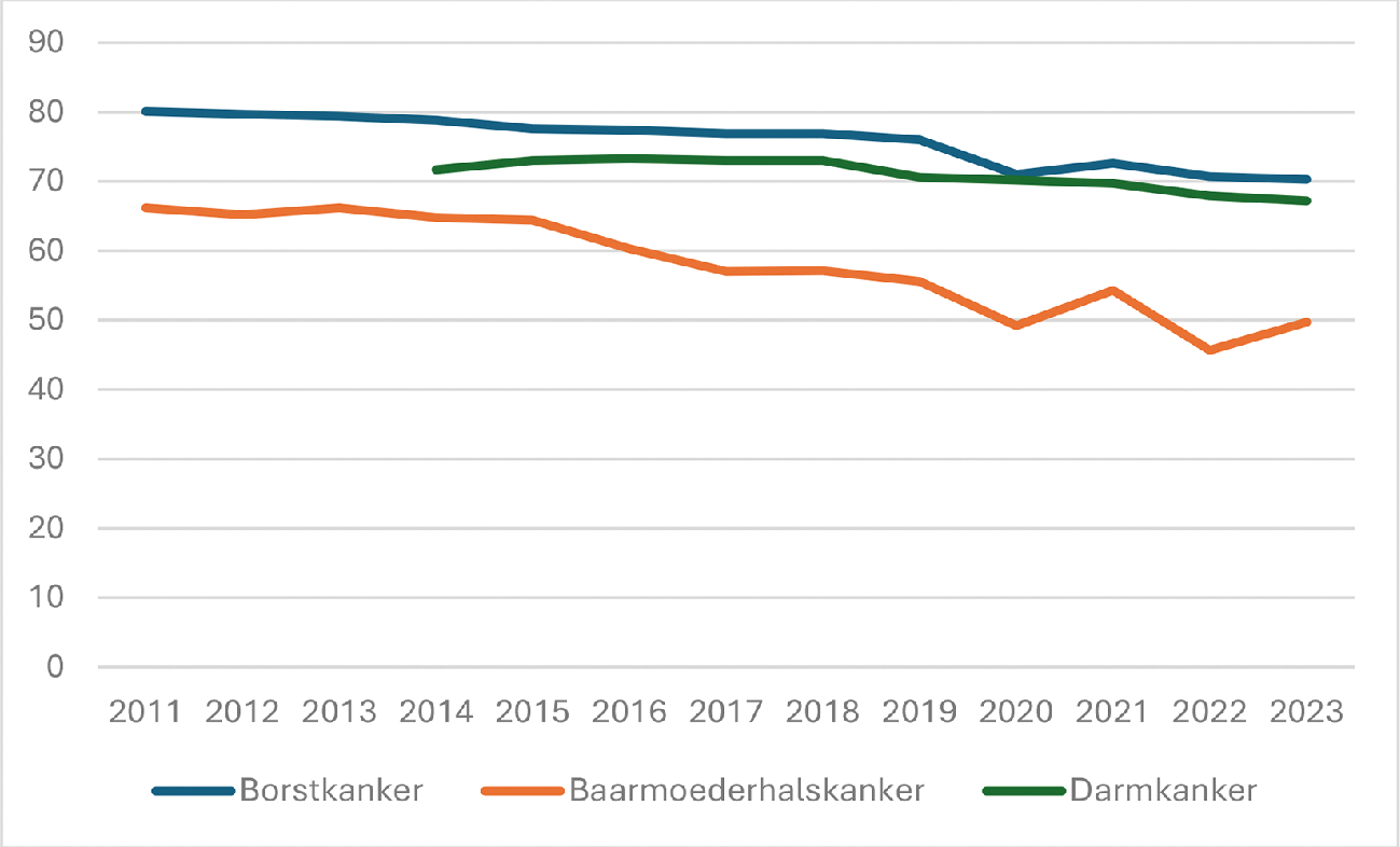 Figuur 1: Deelnamepercentage bevolkingsonderzoeken darmkanker, borstkanker en baarmoederhalskanker tussen 2011 en 2023.