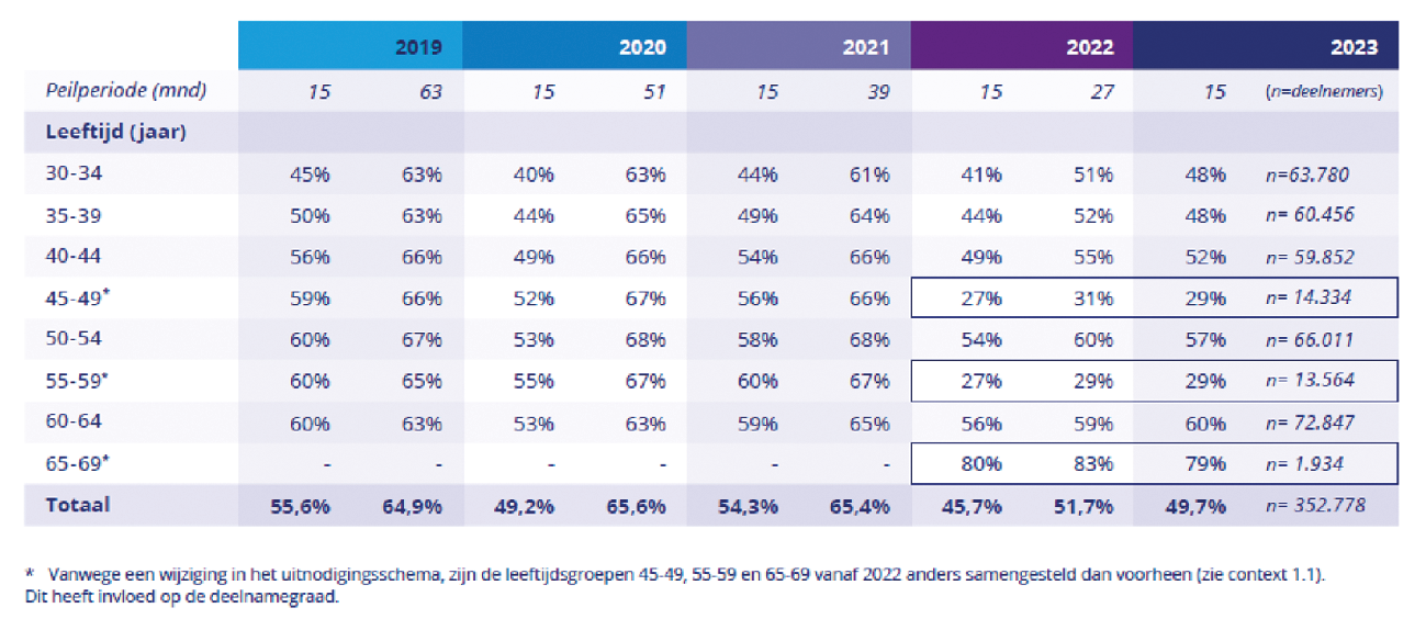 De deelname over 2022 en 2023 laat zich niet één op één vergelijken met de cijfers van voorgaande jaren. De groep deelnemers is immers anders samengesteld omdat in 2017 het uitnodigingsschema van het bevolkingsonderzoek is gewijzigd. Het effect daarvan werd voor het eerst zichtbaar in 2022. Sinds 2022 krijgen 45- en 55-jarigen alleen een uitnodiging, wanneer zij op 40- en 50-jarige leeftijd niet hebben deelgenomen of wanneer zij op die leeftijd een positieve HPV-test hadden. De deelname van vrouwen uit deze leeftijdsgroep (die dus voor een groot deel eerder ook al niet deelnamen) is relatief laag (29% in 2023) en drukt daarmee op het totale deelnamecijfer. Daarentegen worden 65-jarigen die een HPV-positieve uitslag hadden op de leeftijd 60 maar niet zijn doorgestuurd naar de gynaecoloog vanaf 2022 wel uitgenodigd. De deelname van deze groep vrouwen is relatief hoog (79% in 2023). Dit heeft een positieve invloed op het totale deelnamecijfer van het bevolkingsonderzoek.