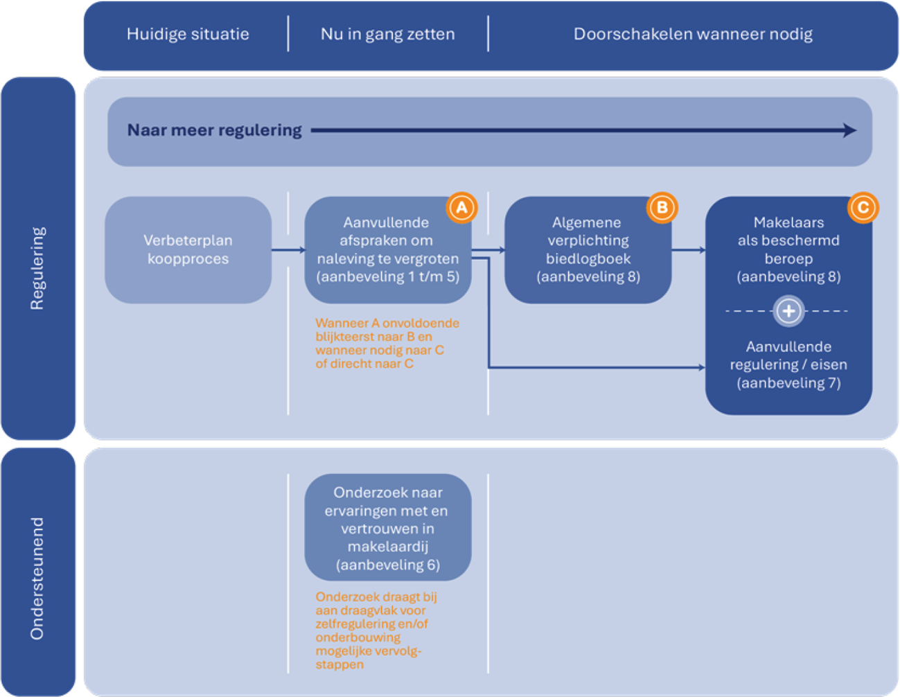 RIGO stelt een volgordelijkheid voor bij de aanbevelingen door eerst zelfregulering te versterken (aanbeveling 1 t/m 5). Als dat niet tot de gewenste resultaten leidt, kunnen stappen richting regulering worden overwogen conform aanbeveling 6 en 7.
