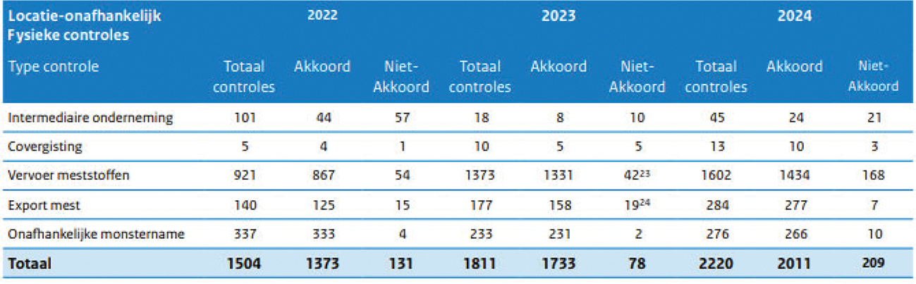 Elk jaar rapporteer ik de Kamers en de Europese Commissie over de voortgang van het Nederlands Mestbeleid met daarin ook de voortgang rondom toezicht en handhaving op het mestbeleid. Hierin zijn ook controles van het vervoer van meststoffen opgenomen. De laatste rapportage over het kalenderjaar 2024 dateert van 30 juni 202515. Onderstaande tabel is afkomstig uit de Rapportage Nederlands Mestbeleid 2024 en toont de uitgevoerde controles van de NVWA op onder andere het vervoer van meststoffen.