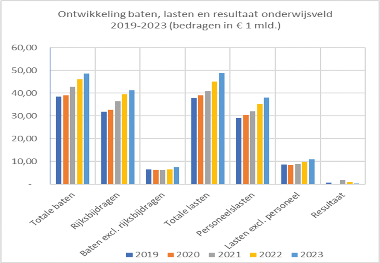 Het resultaat van alle onderwijsbesturen (in alle sectoren) samen was in 2023 € 198 mln. Dit is minder dan 0,5% van de totale baten en minder dan in 2022.