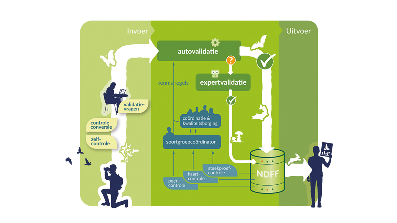 De NDFF bevat meer dan tweehonderd miljoen gegevens van waarnemingen. Aangeleverde gegevens worden gevalideerd om te bepalen of ze betrouwbaar genoeg zijn om op te nemen in de NDFF. Hieronder is dat proces schematisch weergegeven. Het validatieproces geeft mij vertrouwen in de gegevens uit de NDFF.