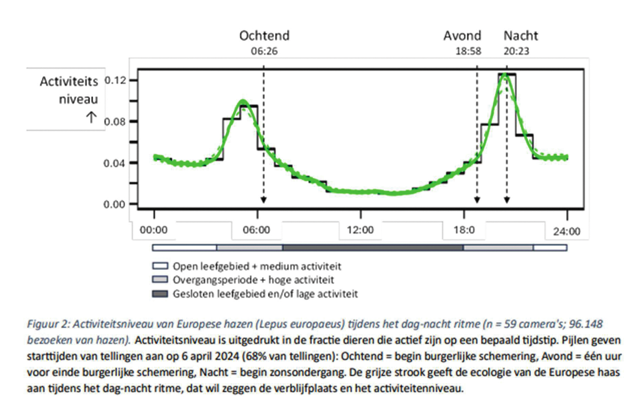 De monitoringvrijwilligers van Sovon tellen ook dagactieve zoogdieren tijdens hun monitoringwerk in steekproefgebieden, met name in het kader van deelmeetnet broedvogelmonitoring (BMP).12 Hierbij gaat het om enkele deelmeetnetten van het landelijke meetnet broedvogels. Hazen zijn primair actief gedurende de schemering (in de twee uur voor zonsopgang en in de twee uur na zonsondergang – dus niet midden in de nacht); zie de onderstaande grafiek uit het als bijlage bij mijn brief van 8 april meegestuurde onderzoek door Hogeschool Van Halle Larenstein.13 In onderstaande grafiek gaat de zon op om 06:56u. Vogeltellers starten hun telling een uur vóór zonsopkomst, dat valt nagenoeg samen met de activiteitspiek van hazen in de ochtend. Daarmee is er een hoge detectiekans op hazen gedurende BMP-tellingen. Tijdens de nacht kunnen weliswaar (iets) hogere absolute aantallen worden waargenomen, maar het is niet aannemelijk dat dit tot andere en/of representatievere aantalstrends zou leiden.