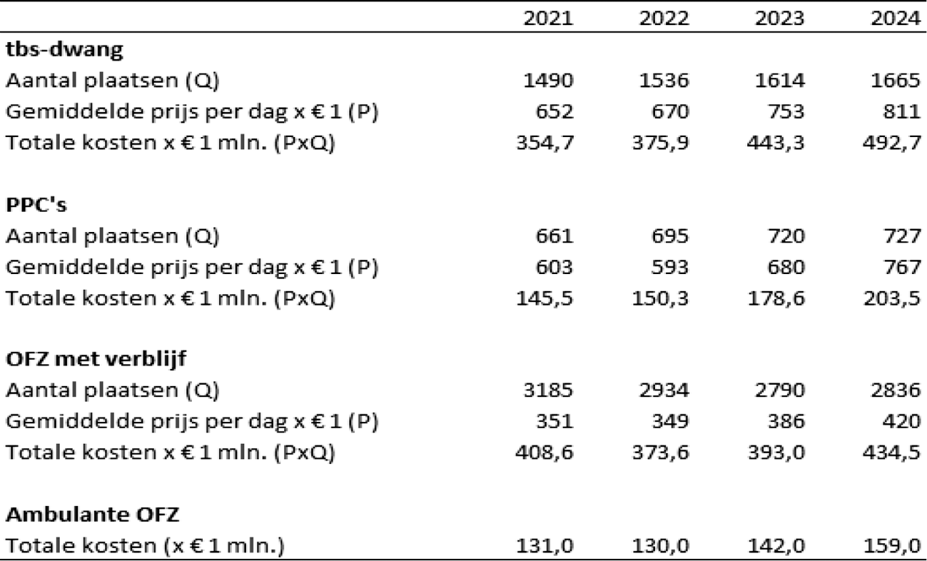 De kosten van de forensische zorg zijn in de afgelopen periode gestegen als gevolg van meerdere ontwikkelingen. Allereerst is het aantal cliënten dat in aanmerking komt voor forensische zorg toegenomen. Daarnaast is de zorgvraag zwaarder en complexer geworden, bijvoorbeeld door cliënten met meervoudige problematiek waardoor intensievere en langdurigere zorgtrajecten nodig zijn. Beperkingen bij de beschikbaarheid van vervolgzorg zorgen voor vertraging in de doorstroom, wat eveneens bijdraagt aan oplopende kosten en blijven cliënten langer in zorg, onder meer vanwege knelpunten bij uitstroom naar passende vervolgvoorzieningen in het gemeentelijk domein.23 Tenslotte heeft ook de jaarlijkse loon- en prijsontwikkeling bijgedragen aan de toename van kosten.