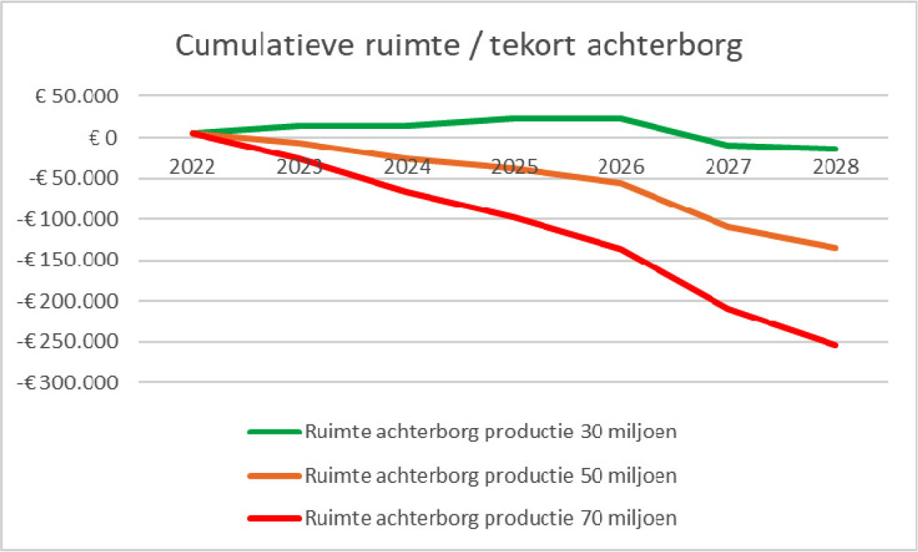 In drie scenario’s is een doorrekening gemaakt van de jaarlijkse ruimte (t/m 2028) binnen de achterborglimiet van € 380 miljoen en de verwachte nieuwe aanvullende leningproductie. Hierbij is gerekend met een productie van € 30 miljoen (door prioritering naar beneden bijgestelde productie), een productie van € 50 miljoen (verwachte productie) en een productie van € 70 miljoen (maximale productie obv pijplijn).