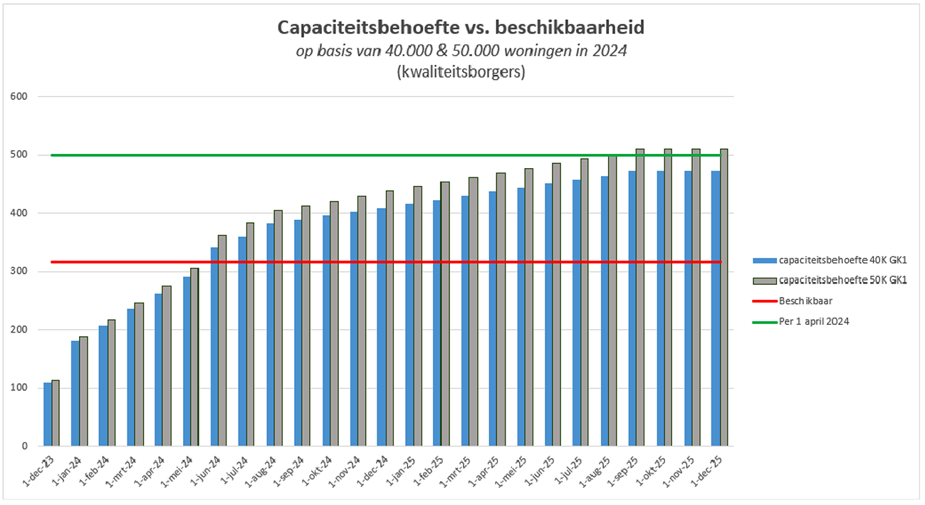 De behoefte aan kwaliteitsborging ontstaat al in de voorbereiding voor de datum van inwerkingtreding, voor bouwactiviteiten die pas na 1 januari 2024 kunnen worden gemeld onder het Wkb-stelsel. Daarbij valt te denken aan het ontwerp, tekeningen, diverse berekeningen, het bouwplan en toetsing door de kwaliteitsborger. Dit proces vergt namelijk een aantal maanden voorbereidingstijd. Veel initiatiefnemers hebben reeds vergunningaanvragen lopen of dienen deze nog in vóór 1 januari. Daarmee wordt verwacht dat in de eerste maanden een beperkt beroep wordt gedaan op kwaliteitsborgers voor nieuw op te starten trajecten. Vanaf april/mei 2024 wordt een toename in de capaciteitsbehoefte verwacht omdat projecten met een voorbereidingstijd van drie maanden vanaf dat moment tot uitvoering komen, waarna de behoefte verder toeneemt naarmate initiatiefnemers meer nieuwe projecten onder kwaliteitsborging starten. In de onderstaande figuur, die door de VKBN is opgesteld, staat weergeven hoe de capaciteitsbehoefte zich naar verwachting verder zal ontwikkelen.