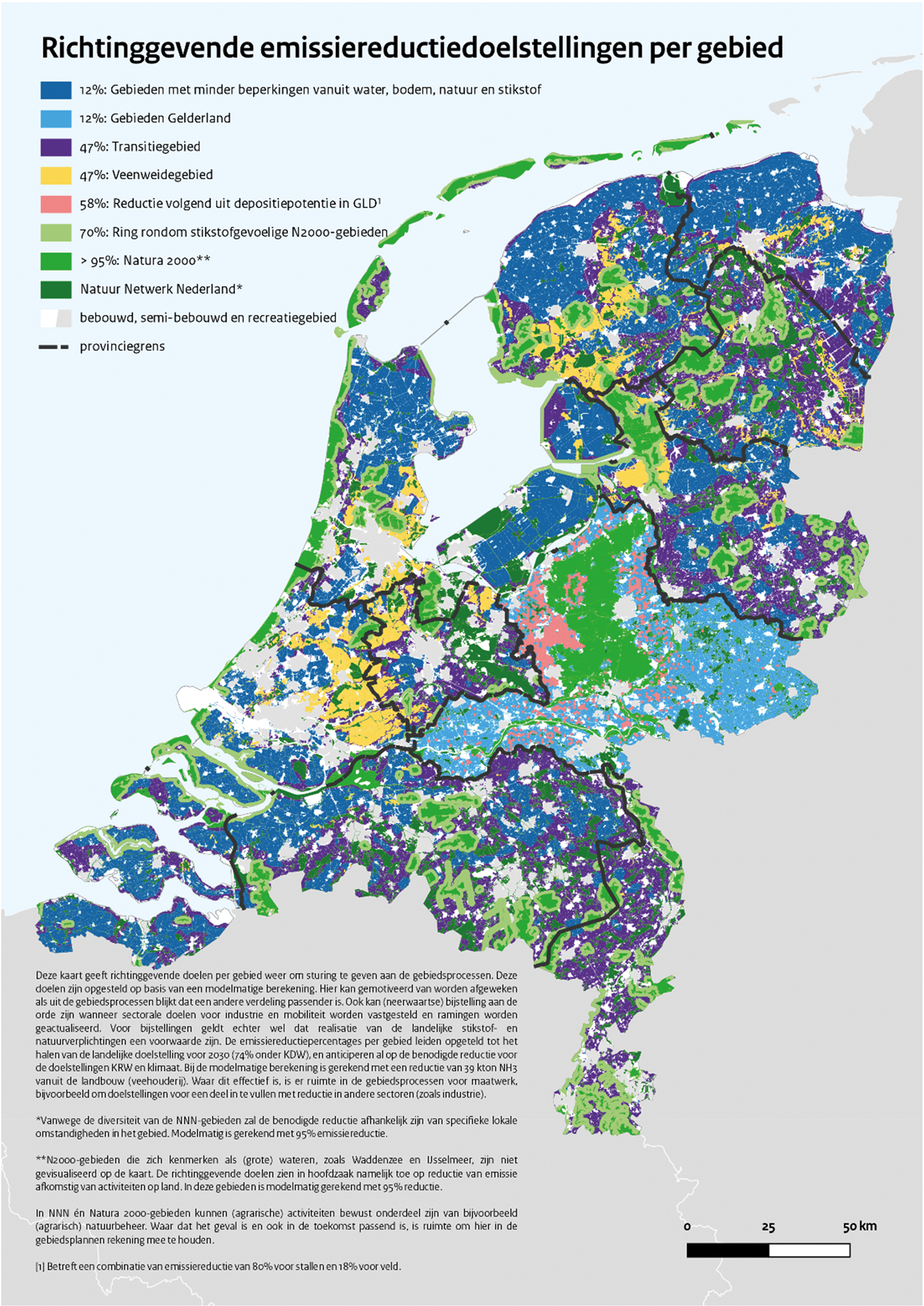 Ten behoeve van de gebiedsprocessen is ook een kaart van Nederland opgenomen met een globale ruimtelijke weergave van de condities van water, bodem, natuur en stikstof in relatie tot landbouw. Deze kaart is bedoeld als hulpmiddel om de structurerende keuzes scherp te stellen, en om bewoners, ondernemers en overheden in gebieden handelingsperspectief te bieden. De doelen die zijn opgenomen betreffen onder meer nieuwe richtinggevende regionale emissiereductiedoelen voor stikstof en de doelen voor de Kaderrichtlijn Water. Uiterlijk in oktober 2022 volgen nadere structurerende keuzes en (nadere) regionalisering van de (overige) doelstellingen voor water, klimaat en natuur. Dit volgt later omdat hier nog nadere uitwerking voor nodig is. Zodra deze doelen bekend zijn worden deze toegevoegd. Het streven is om de regionale doelen voor klimaat vóór de zomer 2022 te communiceren met de provincies.
