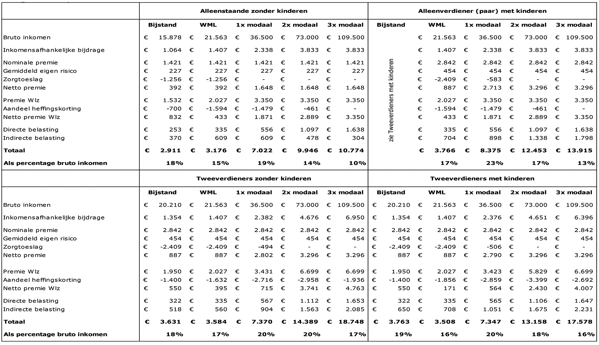 Onderstaande tabel laat voor 2020 zien, wat verschillende huishoudtypen en inkomensklassen aan zorgkosten betalen. Hierin is onderscheid gemaakt naar de inkomensafhankelijke bijdrage, ingeschatte nominale premie Zvw, het gemiddeld eigen risico, de zorgtoeslag, de Wlz-premie minus het aandeel algemene heffingskorting en de bijdrage aan het deel van de zorguitgaven dat via directe en indirecte belastingen wordt betaald.