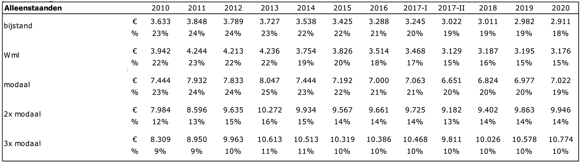 Onderstaande tabel laat voor de jaren 2010 tot en met 2020 zien wat een alleenstaande gemiddeld betaalt aan zorg in euro’s en als percentage van het brutoinkomen. De cijfers zijn berekend voor verschillende inkomensklasses.