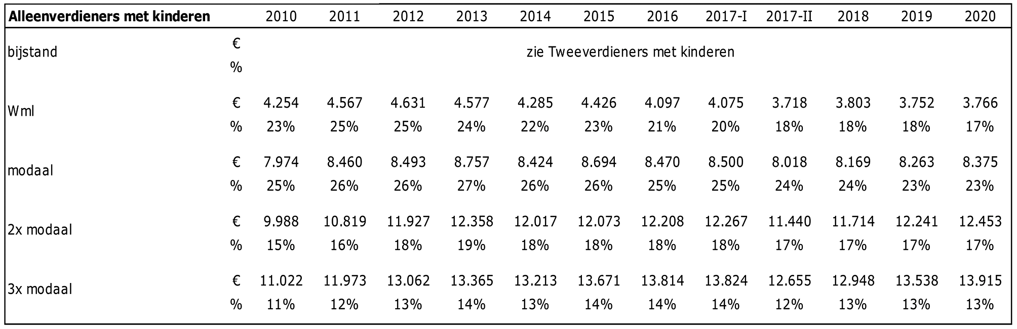 Ontwikkeling totale zorgkosten voor alleenverdieners met kinderen in euro’s per jaar en als percentage van het brutoinkomen voor 2010–2020: