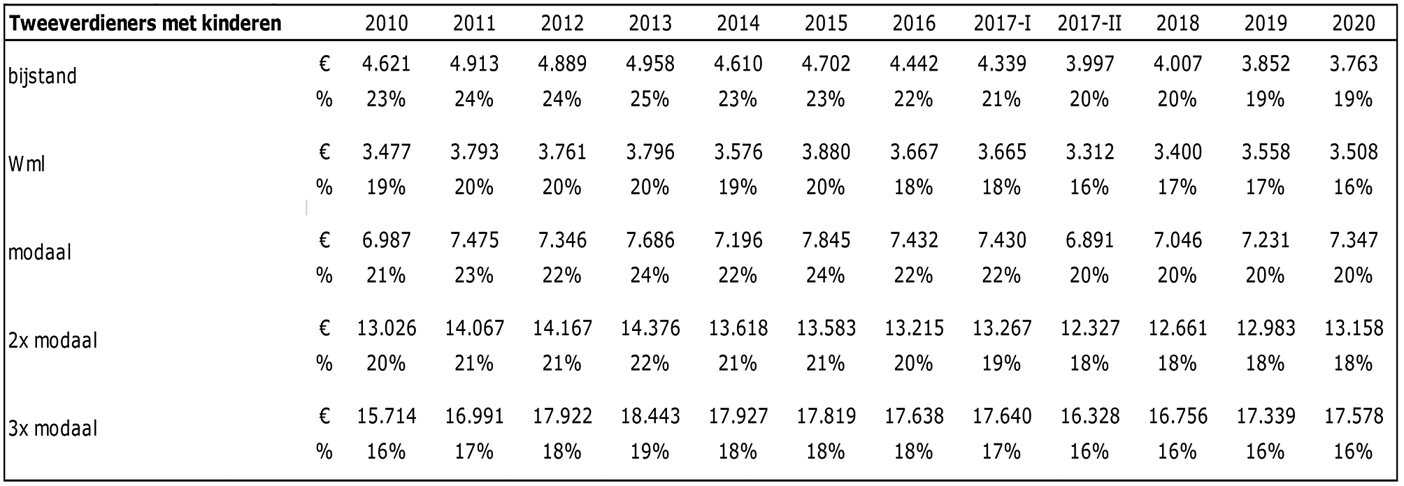 Ontwikkeling totale zorgkosten voor tweeverdieners met kinderen in euro’s per jaar en als percentage van het brutoinkomen voor 2010–2020: