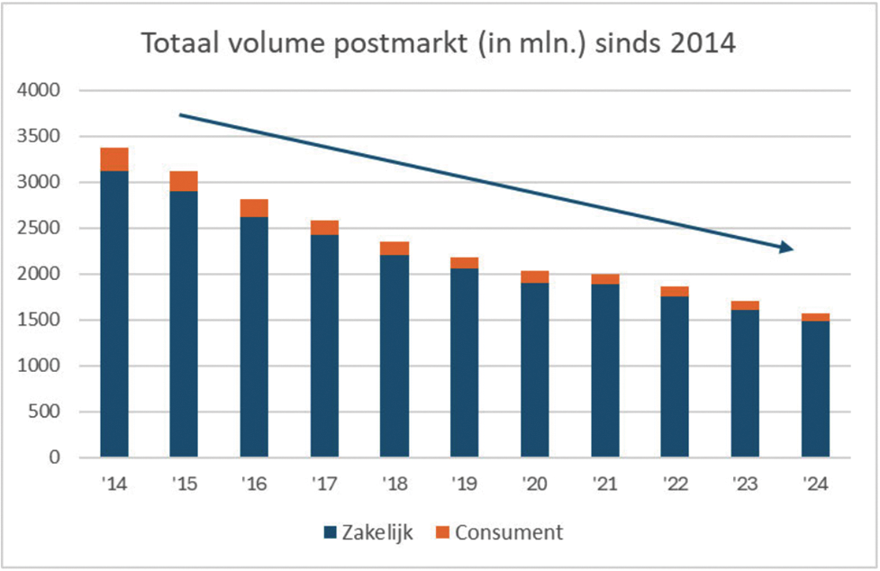 De aanhoudende krimp op de postmarkt zet de uitvoering van de universele postdienst (UPD), het gereguleerde deel van de postmarkt, structureel onder druk. Het postvolume is de afgelopen 10 jaar meer dan gehalveerd, zoals in de onderstaande grafiek weergegeven. Uit het onderzoek van de Autoriteit Consument en Markt (ACM) naar de postmarkt blijkt dat de bezorging van UPD-post onder de huidige wettelijke eisen, met name ten aanzien van snelheid en betrouwbaarheid, op termijn financieel niet houdbaar is1. Volgens PostNL is er nu al sprake van een financieel probleem. De huidige kaders voor de UPD zijn niet meer realistisch. De bouwstenen die de ACM in haar onderzoek aandraagt bieden houvast voor noodzakelijke keuzes in Nederland en sluiten aan bij de richting die elders in Europa al is ingezet.