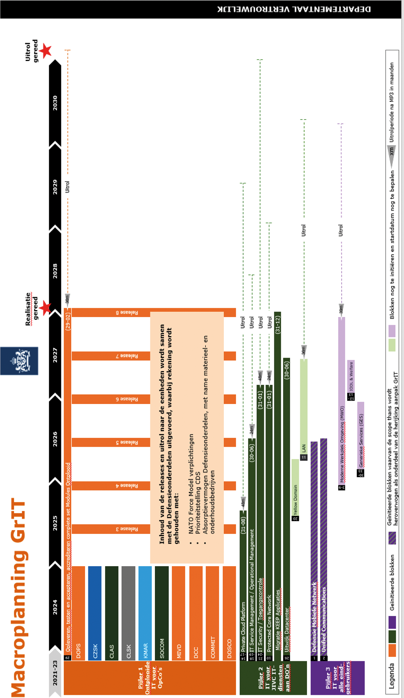 De vertraging is grotendeels te wijten aan eerdere tegenvallende resultaten, maar ook aan de vele afhankelijkheden tussen de bestaande en de nieuwe IT-omgeving, waaronder complexe koppelingen. In de nieuwe planning is tevens de gewijzigde geopolitieke situatie vertaald naar de aanpak van het programma en gekoppeld aan operationele prioriteiten. Het GrIT-programma heeft tevens de besturing overgeschakeld naar het opleveren op basis van releases. Hiermee wordt, door het bieden van enkele opleveringen per jaar (releases), sneller de noodzakelijke toegevoegde waarde aan de defensieonderdelen geleverd dan in de meest recente (juni 2023) vastgestelde integrale planning beoogd was.