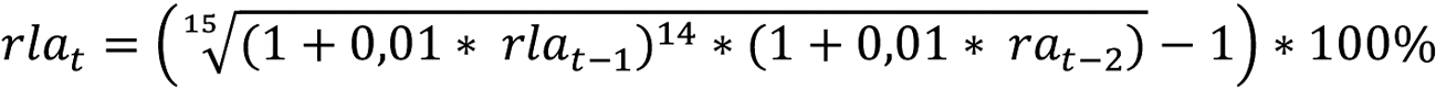 rat–2: het rendement in procenten op aandelen voor het tweede kalenderjaar voorafgaande aan het kalenderjaar, bedoeld in het derde lid, welk rendement wordt gesteld op de procentuele verandering van de MSCI Europe Standard Gross Local Index aan het einde van het tweede kalenderjaar voorafgaande aan het kalenderjaar, bedoeld in het derde lid, ten opzichte van deze index aan het einde van het derde kalenderjaar voorafgaande aan het kalenderjaar, bedoeld in het derde lid.