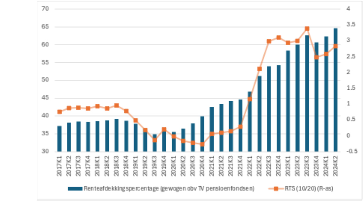 Pensioenfondsen moeten zorg dragen voor een levenslange pensioenuitkering. Om dit te bereiken beheersen zij renterisico’s zowel aan de vermogenszijde als aan de verplichtingenzijde van hun balans. Een rentestijging heeft immers niet alleen implicaties voor hun belegd vermogen, maar ook voor de pensioenuitkeringen die zij hebben toegezegd. Een rentestijging betekent dat de waarde van toekomstige pensioenuitkeringen daalt omdat met een hogere rentevoet de toekomstige uitkeringsstroom wordt verdisconteerd. De dekkingsgraad die de verhouding weergeeft tussen pensioenverplichtingen en pensioenvermogen stijgt dan. Per saldo kent een pensioenfonds een risico dat de rente daalt, omdat een rentedaling tot een sterke stijging leidt van de waarde van de verplichtingen. Vandaar dat pensioenfondsen over het algemeen zich indekken voor een rentedaling.