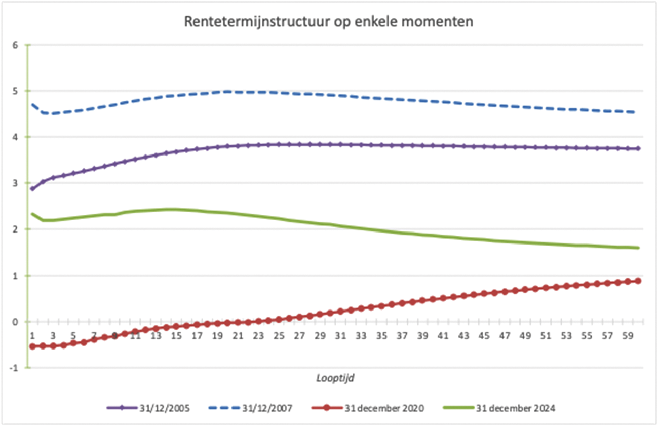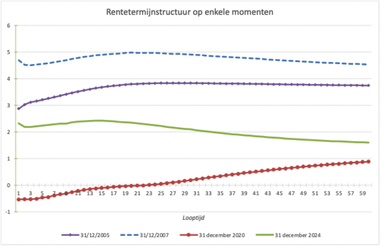 6. De grote vraag naar renteafdekking heeft grote marktimpact op de rentecurve (RTS) zoals de volgende figuur van vier tijdstippen tussen 2005 en 2024 laat zien.