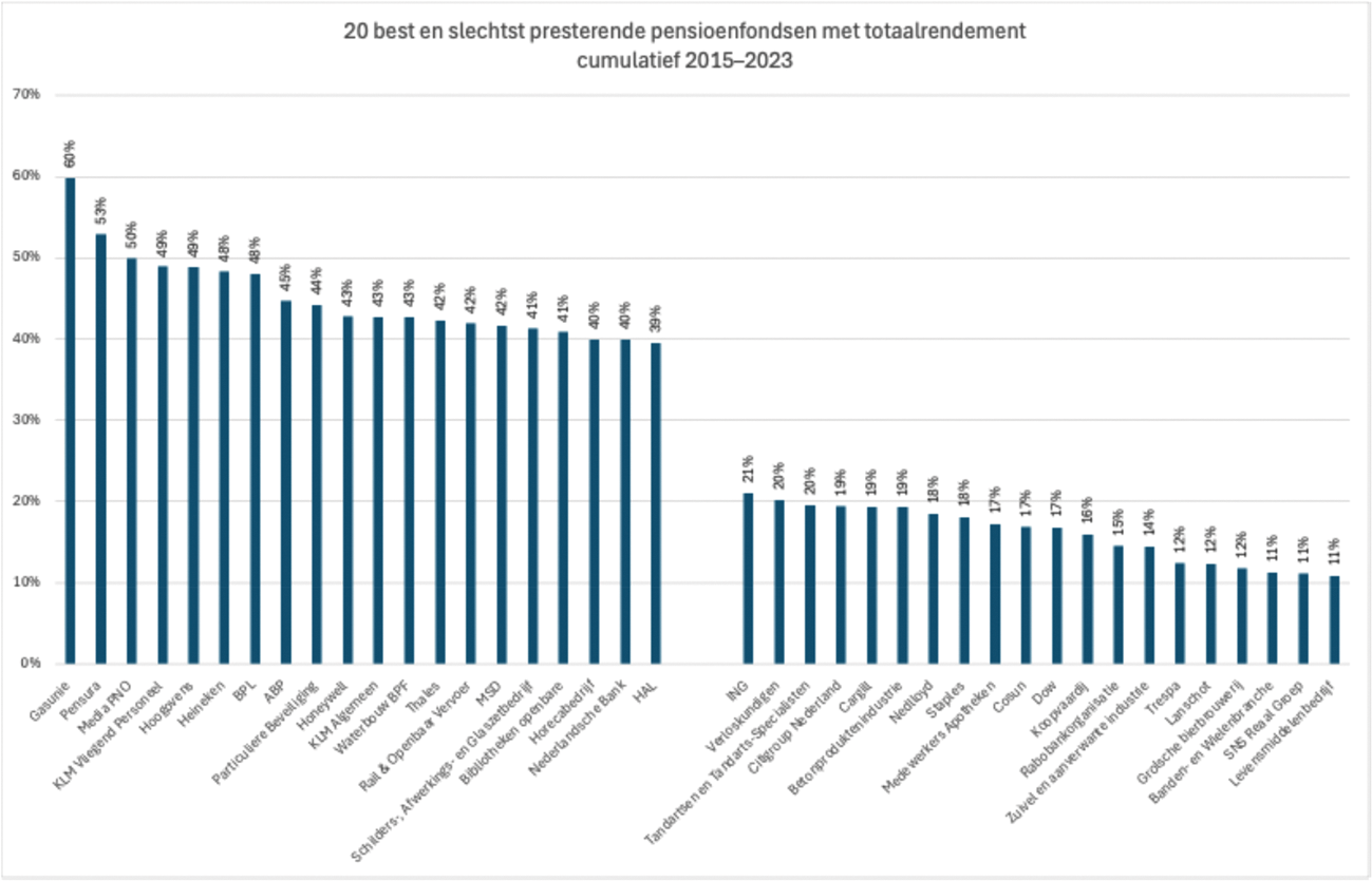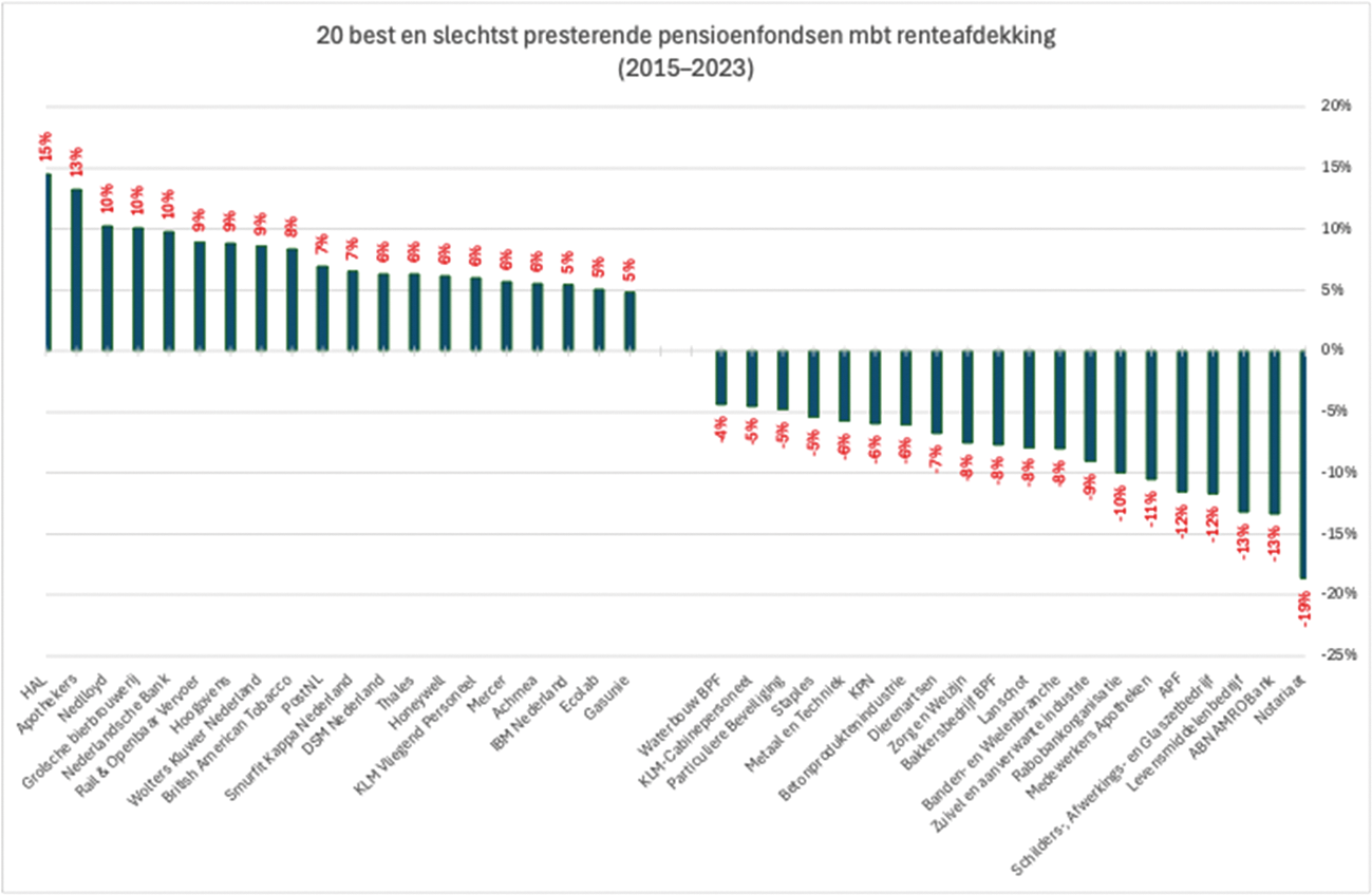 9. Uit bovengemeld onderzoek volgt ook een zeer grote spreiding van rendementen uit de renteafdekking van de pensioenfondsen (zie onderstaande figuur waar de 20 best en slechtst presterende fondsen zijn opgenomen. In deze grafiek is het cumulatieve rendement op de renteafdekking in beeld gebracht voor de 20 beste en slechtste performende pensioenfondsen op het gebied van rendement rentehedge (voor de 80 fondsen die niet zijn opgenomen ligt het rendement tussen 5% en –4%) over de periode 2015–2023.
