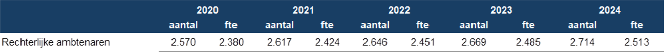 In het Jaarverslag van de Rechtspraak 2024 worden de volgende aantallen rechterlijke ambtenaren genoemd: