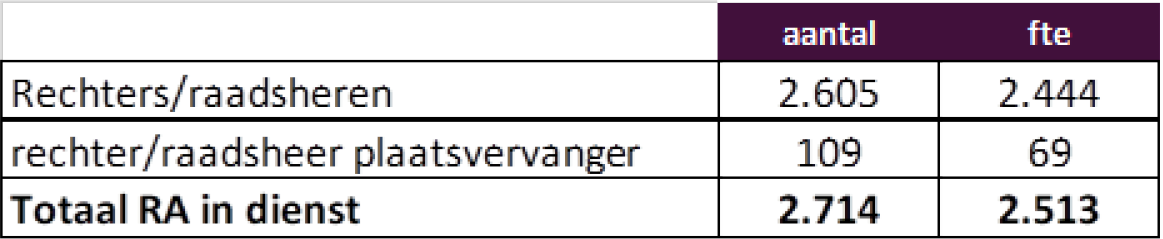 De aantallen en fte rechterlijke ambtenaren zijn inclusief de rechter- en raadsherenplaatsvervangers met een aanwijzing voor een vast aantal uren per maand. De verhoudingsgetallen tussen rechter- en raadsherenplaatsvervangers en rechters en raadsheren in dienst is weergegeven in onderstaande tabel. Het gaat hier om de stand in dienst in december 2024, en is inclusief de rechters-plaatsvervangers die op basis van de 70+ regeling werkzaam zijn: