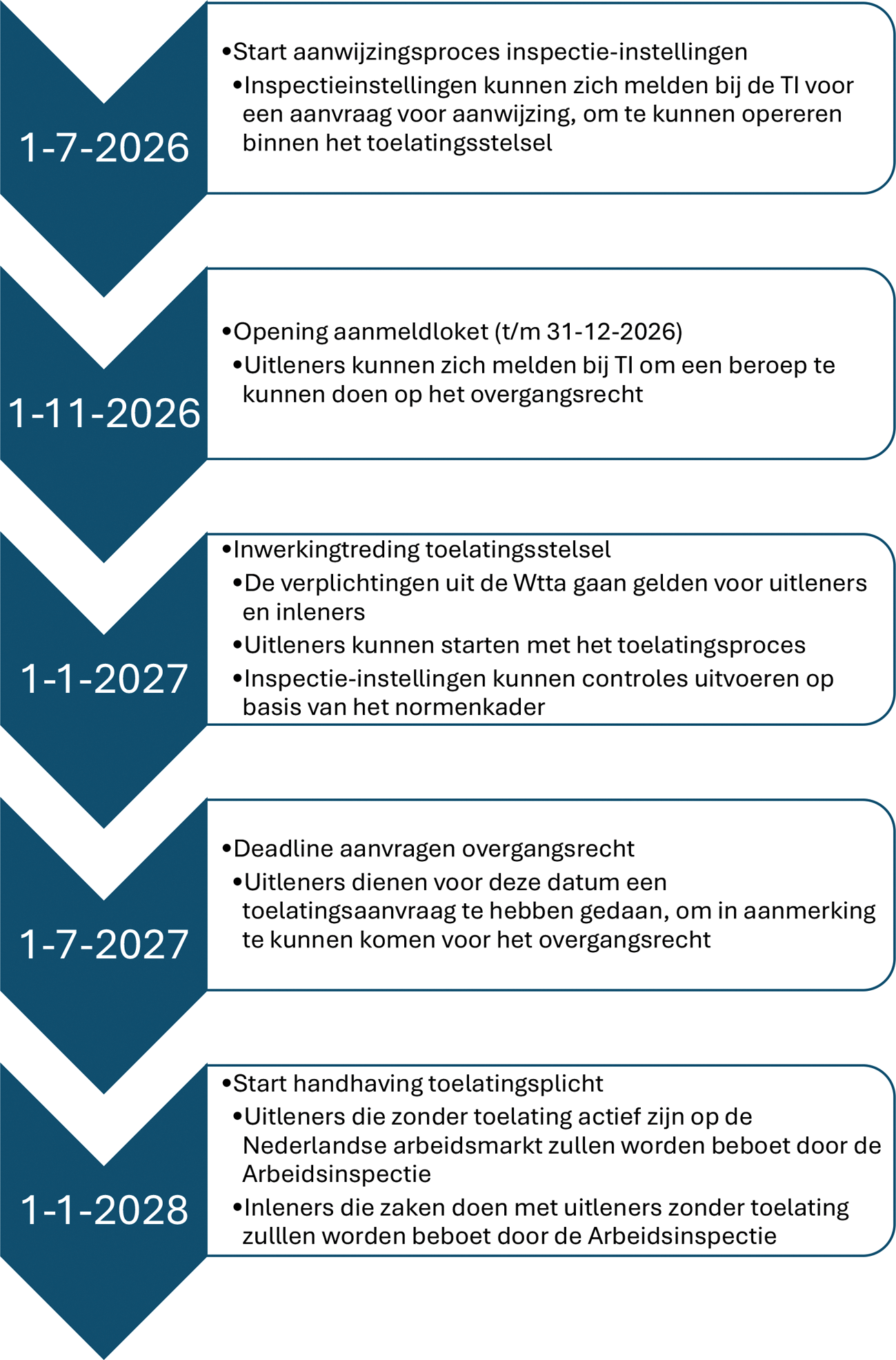 De beoogde inwerkingtredingsdatum voor het toelatingsstelsel is 1 januari 2027. Dit betekent dat op 1 januari 2028 de toelatingsplicht zal ingaan, vanaf dit moment zal de Nederlandse Arbeidsinspectie gaan handhaven op de toelatingsplicht en zullen in- en uitleners die zich niet aan de wet houden worden beboet. Voor een effectieve invoering van het stelsel zullen enkele onderdelen van de wet ná publicatie van de wet maar vóór de inwerkingtredingsdatum van het stelsel in werking treden. Ik zal de verschillende relevante data omtrent de inwerkingtreding hieronder kort toelichten. Onderaan deze brief vindt u een schematische weergave van de verschillende relevante data voor inwerkingtreding.