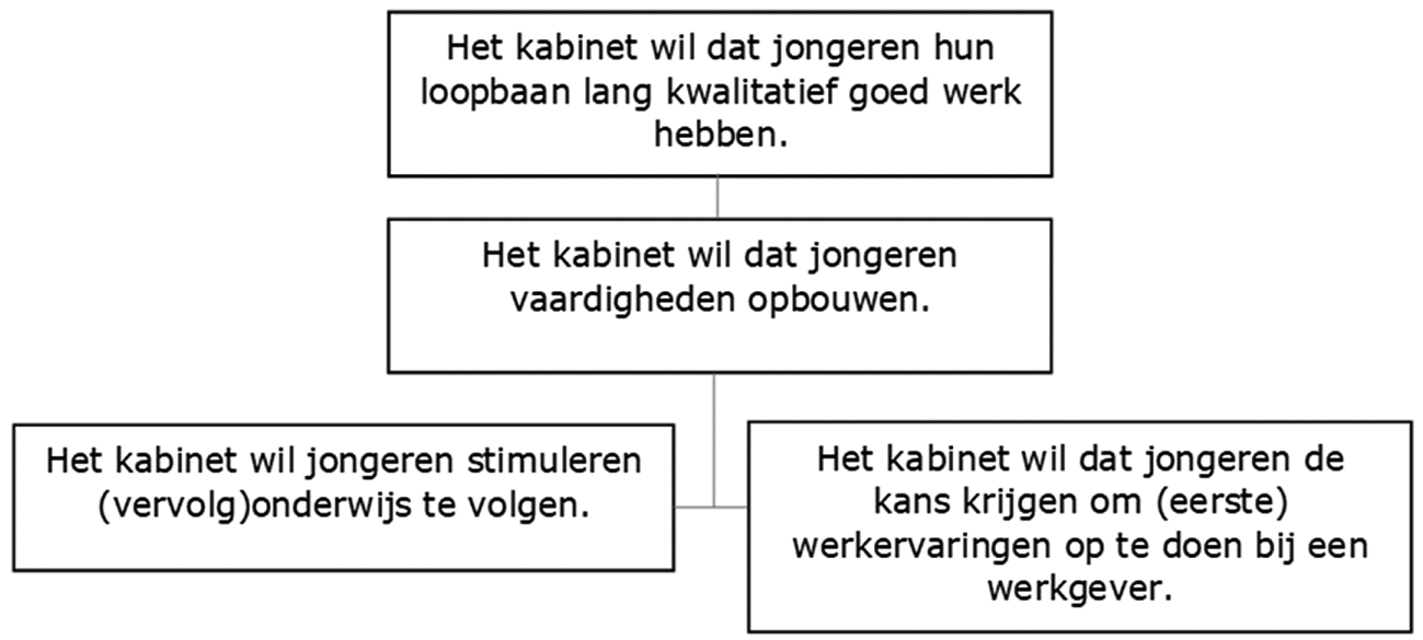 Zoals in de kabinetsreactie omschreven, is het doel van het wettelijk minimumloon om werknemers te verzekeren van een beloning die gezien de algehele welvaartssituatie als minimaal aanvaardbare tegenprestatie voor de verrichte arbeid kan worden beschouwd. Voor jongeren geldt een lager minimumjeugdloon om te zorgen dat jongeren gedurende hun hele loopbaan kwalitatief goed werk hebben. Voor kwalitatief goed werk is het van belang dat jongeren vaardigheden kunnen opdoen. Belangrijke manieren om deze vaardigheden te kunnen ontwikkelen, zijn het volgen van onderwijs en het opdoen van werkervaring. Deze overwegingen zijn hieronder schematisch weergegeven.