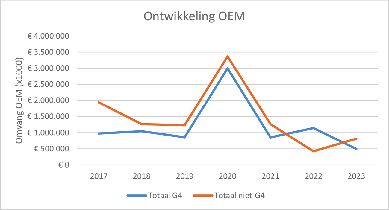 De OEM is samengesteld uit zes componenten4 die allemaal in meer of meerdere mate fluctueren per jaar. De totale OEM uitgesplitst naar G4 en overige gemeenten ontwikkelt zich volgens onderstaand figuur. De stijging in 2020 is te verklaren door de verkoop van Eneco-aandelen door 44 gemeenten voor EUR 4,1 miljard. Ongeveer de helft van de aandelen was in handen van Rotterdam en Den Haag, wat de vrijwel gelijke stijging voor zowel G4 als niet-G4 gemeenten verklaart. De daling van 2021 naar 2022 voor de overige gemeenten is te wijten aan een daling van meerdere componenten, waarbij de grootste daling zich voordoet bij grondexploitatie gevolgd door overige belastingen. De daaropvolgende stijging van 2022 naar 2023 is vooral het gevolg van stijgende inkomsten uit grondexploitatie en treasury.
