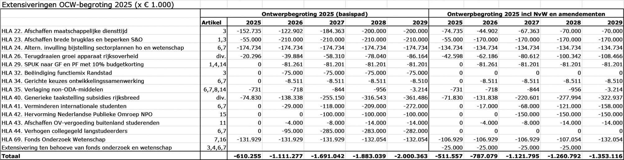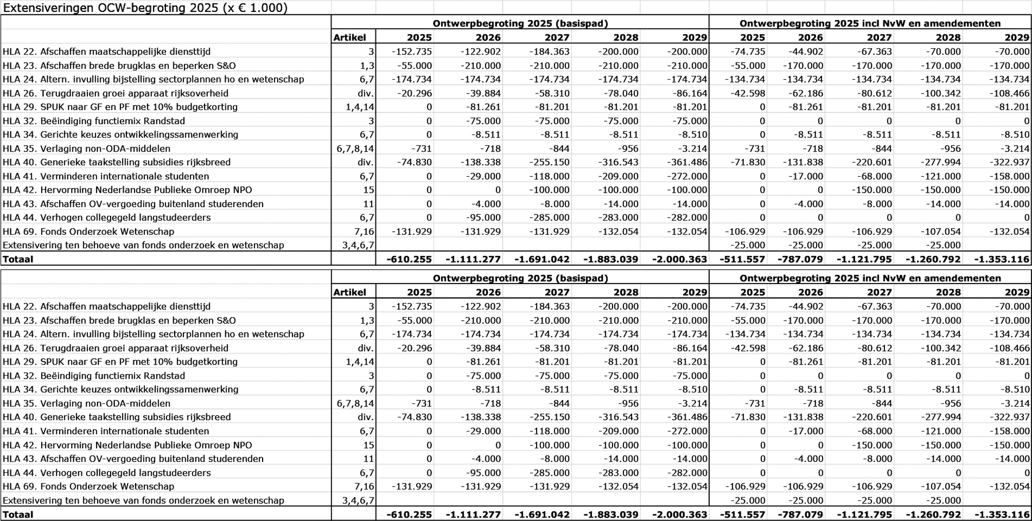 In het Coalitieakkoord Rutte-IV 2022–2025 is voor specifiek het wo structureel ca. € 370 miljoen geïnvesteerd (bijvoorbeeld voor sectorplannen en startersbeurzen) en incidenteel € 144 miljoen per jaar (bijvoorbeeld voor stimuleringsbeurzen) via het fonds voor onderzoek en wetenschap. Op prijspeil 2024 is dat € 415 miljoen en € 161 miljoen. In het Hoofdlijnenakkoord Schoof 2025–2028 is voor specifiek het wo een extensivering doorgevoerd van € 254 miljoen structureel miljoen (startersbeurzen en internationale studenten) en € 132 miljoen per jaar op het fonds voor onderzoek en wetenschap op prijspeil 2024. Daarnaast wordt op lange termijn structureel € 62 miljoen op het NWO bezuinigd, waarvan € 40 miljoen vanaf 2030. Naast deze beleidsmatige mutaties is er ook vanuit het groeifonds geïnvesteerd in het onderwijs, met de programma’s Npuls, LLO-katalysator en de Nationale Aanpak Professionalisering Leraren (in totaal € 1,1 miljard incidenteel). Ook wordt geïnvesteerd in het opleiden van talent voor de semicon industrie (€ 450 miljoen incidenteel tot en met 2030 en structureel € 80 miljoen).