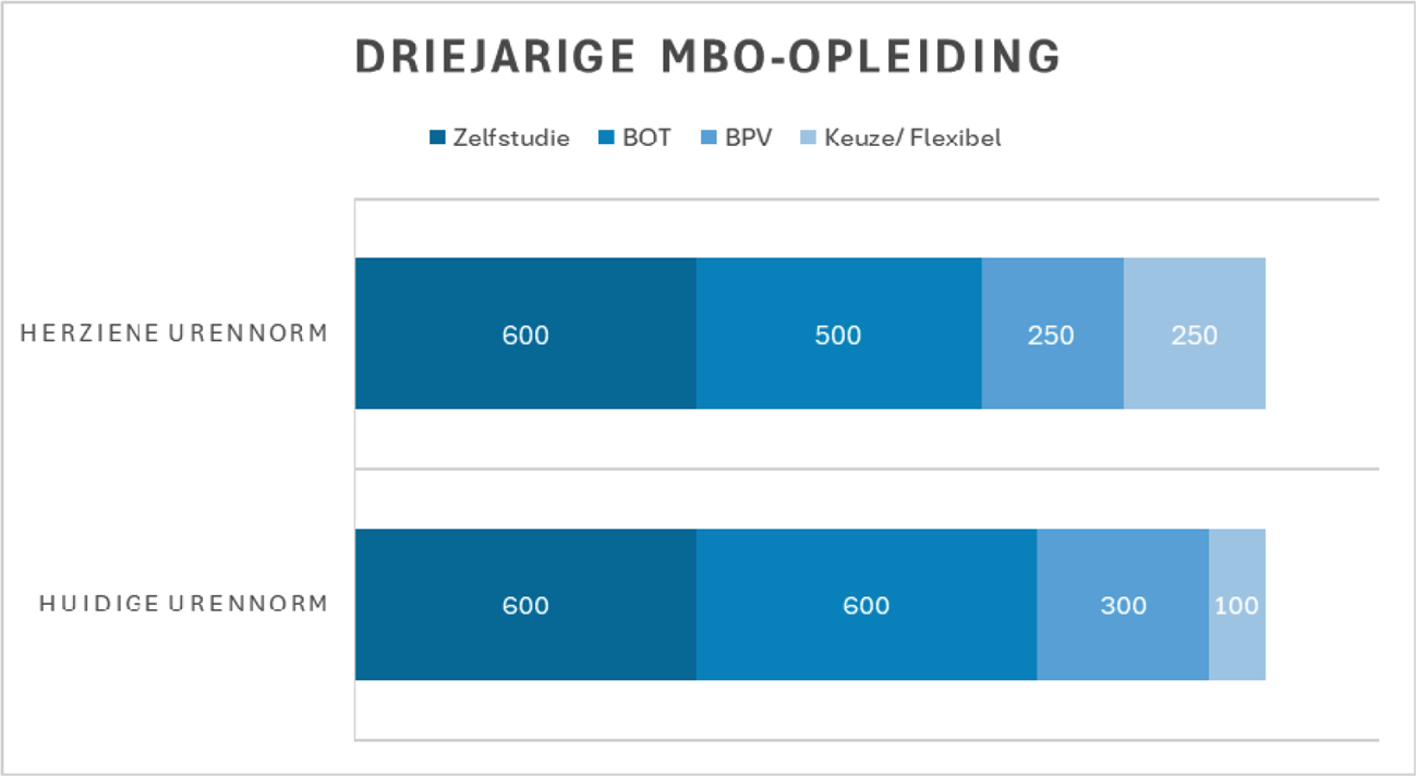 Reguliere opleidingen in het mbo zijn voltijds ingericht en hebben per volledig studiejaar een studielast van ten minste 1600 klokuren. Dit is gebaseerd op 40 weken van 40 uur. Er is niet getornd aan de studiebelasting, omdat de wijziging van de urennorm niet als doel heeft dat studenten een zwaardere of lichtere inspanning zouden moeten leveren. De inspanningen van studenten blijven ongewijzigd, maar met de introductie van de flexibele uren, naast een stevige basis van bot- en bpv-uren, kan aan studenten meer variatie in onderwijsvormen worden geboden, waaronder hybride onderwijsvormen op het snijvlak van lessen op school en bpv. Hierdoor worden studenten nog beter voorbereid op de arbeidsmarkt.