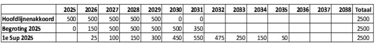 Besteding van een groot deel van de middelen voor 2029 lijkt daarmee niet realistisch. Als gevolg daarvan is de reeks bij 1e suppletoire begroting aangepast. Zie bijgevoegde tabel.