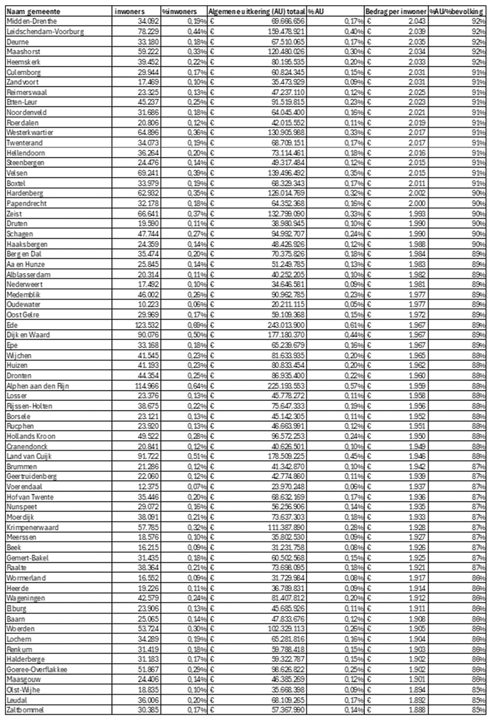 Kunt u per gemeente aangeven hoeveel zij, afgezet tegen het inwonersaantal, percentueel krijgen van de totale som?