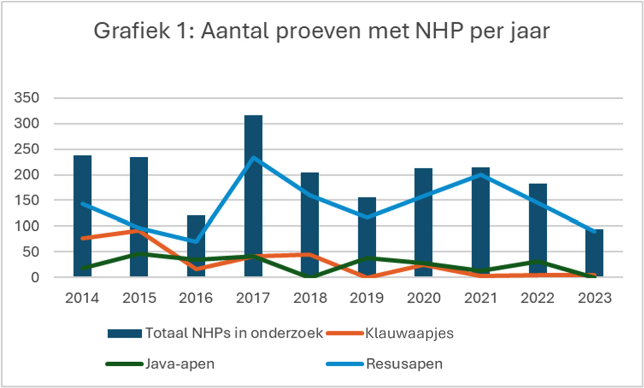 In tabel 1 is het totaal aantal geregistreerde dierproeven, inclusief NHP, afgezet tegen het aandeel NHP in onderzoek per jaar. In de onderstaande grafiek is het totaal aantal proeven met NHP per jaar weergegeven, maar dan ook per soort uitgesplitst. In 2016 lijkt er een dip en in 2017 een stijging te zijn. Deze «uitschieters» zijn te verklaren door de timing van de registratie en de duur van het onderzoek. Dieren worden pas meegeteld in het jaar dat de proef is afgerond. Voor meer informatie hierover verwijzen wij u naar de tekst in de «Zo doende» van 2017. Vanaf 2019 is er een kleine stijging te zien, deze is te verklaren door het Covid-19 onderzoek in de daaropvolgende jaren, daarna neemt het onderzoek met NHP weer af. De data over 2024 wordt in Q1 van 2026 verwacht.
