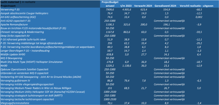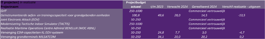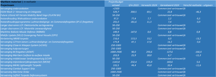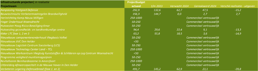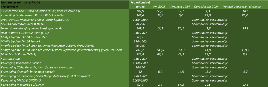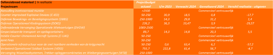 Met ingang van 2024 is het DPO uitgebracht met Verantwoordingsdag in mei. Vanwege het aangepaste verzendmoment van het DPO neemt Defensie voortaan de projecten in realisatiefase met een projectbudget boven de ondergrens (€ 50,0 miljoen) op in een tabel per artikel. Deze tabel is herkenbaar en sluit aan bij het DPO. Deze aanpassing is verwekt in de ontwerpbegroting 2025 en om de voorheen gehanteerde tabellen niet opnieuw te presenteren in dit jaarverslag is deze koppeling in jaarverslag behouden. Deze tabellen wijken enigzins af van de tabellen uit de ontwerpbegroting 2024 maar sluiten aan op de tabellen die op hetzelfde moment (Prinsjesdag 2023) aan uw Kamer zijn aangeboden in het DPO. In deze tabel geeft Defensie de (actuele) budgetreeksen weer per project.