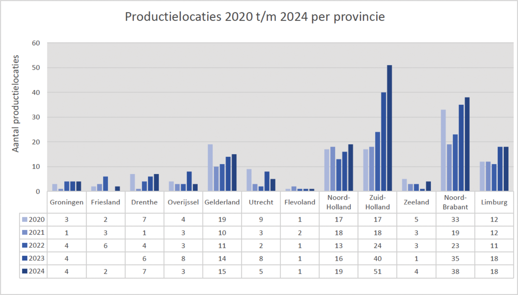 Zoals de politie in haar Nationaal Overzicht Drugslocaties aangeeft zijn er in 2024 167 productielocaties opgerold; dit betreft «het aantal productielocaties synthetische drugs, heroïne en cocaïne». Een productielocatie betreft een locatie waar de productie van synthetische drugs, heroïne en/of cocaïne plaatsvindt. Dit betreft conversie, synthese, kristallisatie, tabletteren, extractie, versnijden, bewerken en/of verpakken van drugs. Zie ook de tabel in de bijlage.