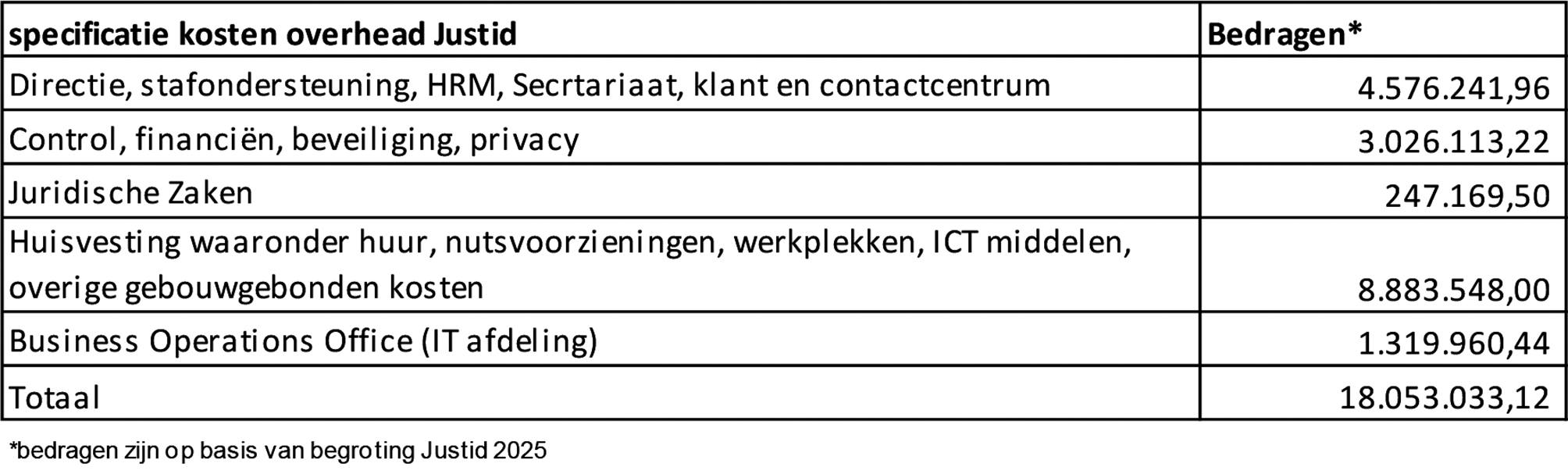 De overhead van Justid bestaat uit de gebruikelijke PIOFACH-processen en zaken die niet direct of indirect aan de dienstverlening kunnen worden toegerekend. In 2024 betrof de overhead van Justid ongeveer 20%. Zoals toegelicht onder tabel 136 in het jaarverslag is er afgelopen jaar een begin gemaakt in het beter toewijzen van deze kosten aan de dienstverlening. De komende tijd zal Justid daar verdere scherpte in aanbrengen. De specificatie van de kosten overhead staan in de tabel in de bijlage
