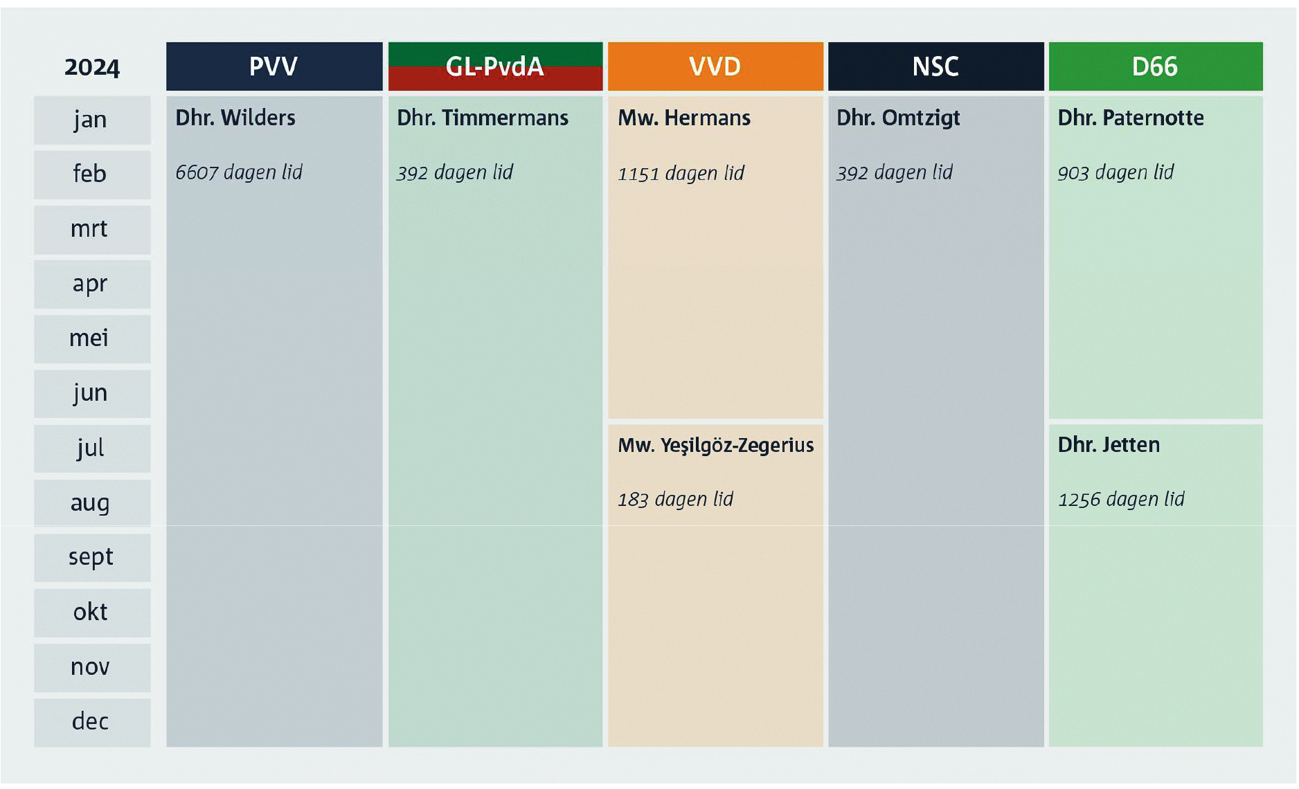 De samenstelling van de commissie is geregeld in artikel 7.5 van het Reglement van Orde van de Tweede Kamer (zie ook het hoofdstuk over werkwijze). Hieruitvolgend bestond de commissie van 1 januari t/m 1 juli 2024 uit de fractievoorzitters van de PVV (het lid Wilders), GroenLinks-PvdA (het lid Timmermans) en Nieuw Sociaal Contract (het lid Omtzigt). Aangezien de fractievoorzitters van de VVD en D66 nog deel uitmaakten van het demissionaire kabinet, vervingen de leden Hermans (VVD) en Paternotte (D66) de leden Yeşilgöz-Zegerius (VVD) en Jetten (D66). Met het aantreden van het kabinet-Schoof op 2 juli 2024 traden de leden Yeşilgöz-Zegerius en Jetten toe tot de commissie. Derhalve bestond de commissie van 2 juli t/m 31 december 2024 uit de leden Wilders (PVV), Timmermans (GroenLinks-PvdA), Yeşilgöz-Zegerius (VVD), Omtzigt (Nieuw Sociaal Contract) en Jetten (D66). Het lid Wilders was gedurende het hele jaar commissievoorzitter.