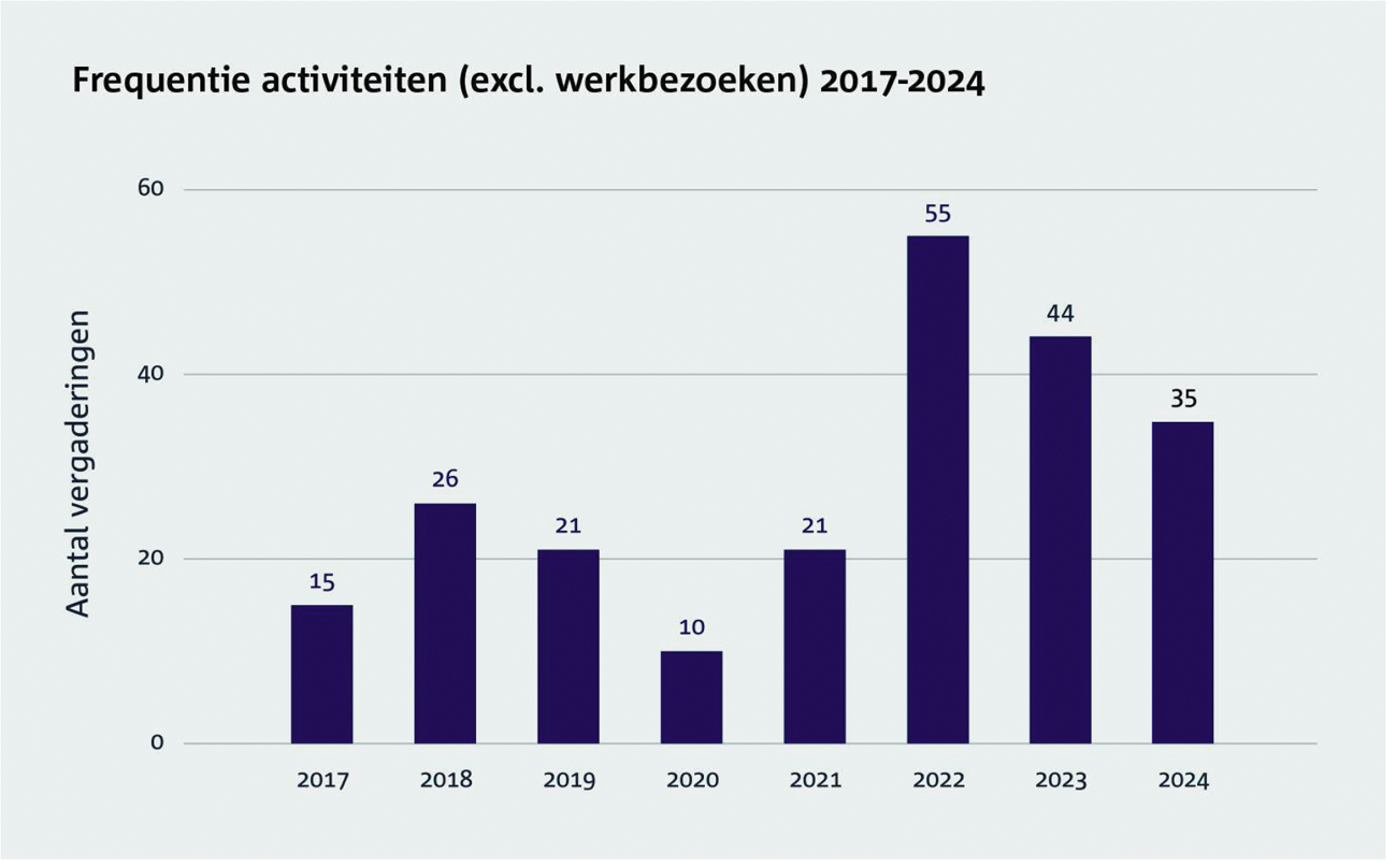 In 2024 kwam de commissie 35 keer bijeen voor een vergadering en legde zij één werkbezoek af. Dit zijn minder activiteiten dan in 2023. Vanwege de formatie besloot de commissie verdiepende activiteiten niet te plannen, in afwachting van de definitieve commissiesamenstelling na de formatie. De gemiddelde opkomst van de commissieleden lag in 2024 op 78%, inclusief werkbezoeken. Exclusief werkbezoeken lag het percentage op 79%.