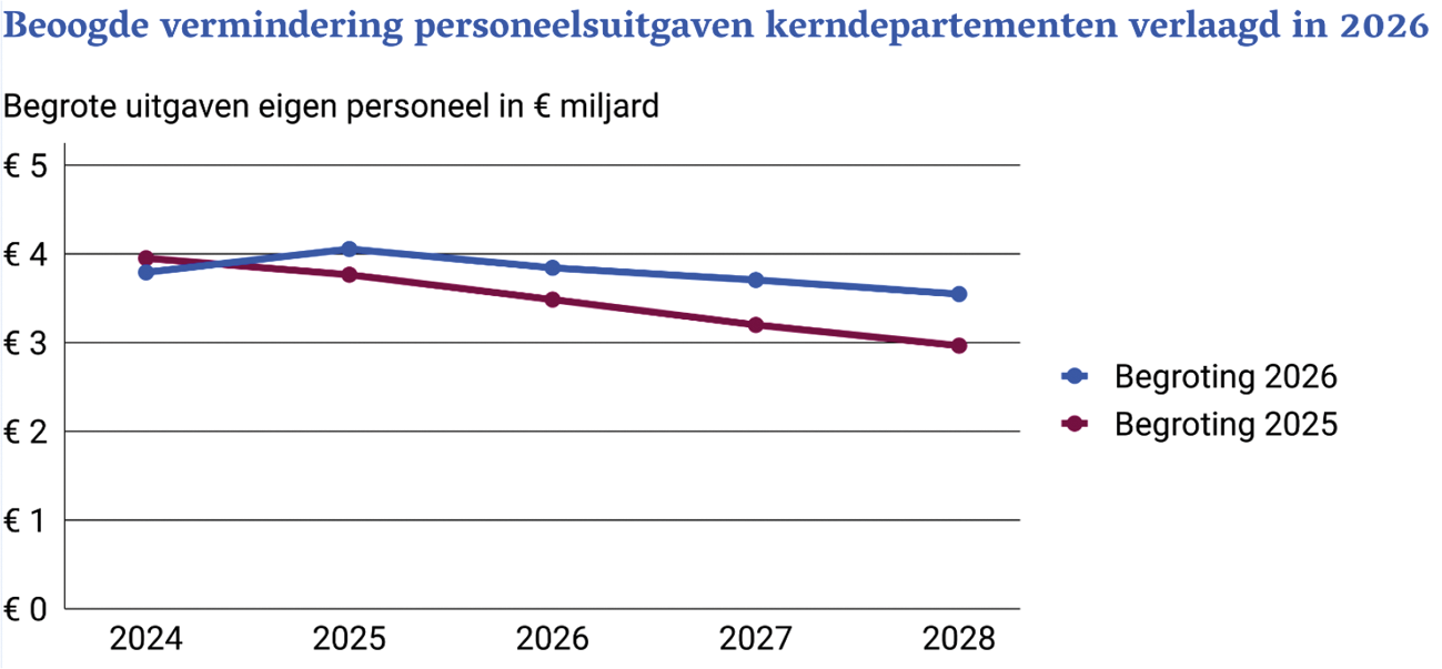 In de begroting 2025 was dit voornemen zichtbaar doordat de geraamde apparaatsuitgaven van kerndepartementen in de periode 2025–2028 werden afgebouwd met 22% ten opzichte van 2024. Wij zien dat in 2026 de uitgaven van de kerndepartementen aan eigen personeel 10% hoger zijn dan vorig jaar werd voorzien en met € 3,85 miljard vrijwel gelijk aan 2024. Ook is de afname in de jaren tot 2028 lager dan in de voorgaande begroting.