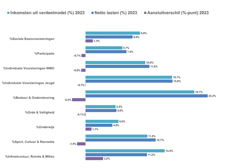 Voor de analyse is gekeken naar de inkomsten uit het verdeelmodel en de netto lasten per uitgavencluster gedefinieerd als het relatieve aandeel dat zij hebben binnen het totaal van de uitgavenclusters. De 6,0% die bijvoorbeeld in figuur 4 wordt genoemd als inkomsten uit het verdeelmodel voor het cluster Onderwijs wil zeggen dat alle gemeenten samen gemiddeld 6,0% van de inkomsten uit het verdeelmodel ontvangen op basis van het cluster Onderwijs. Volgens dezelfde werkwijze hebben de gemeenten in 2023 volgens hun jaarrekening gemiddeld 4,9% uitgegeven aan het uitgavencluster Onderwijs.
